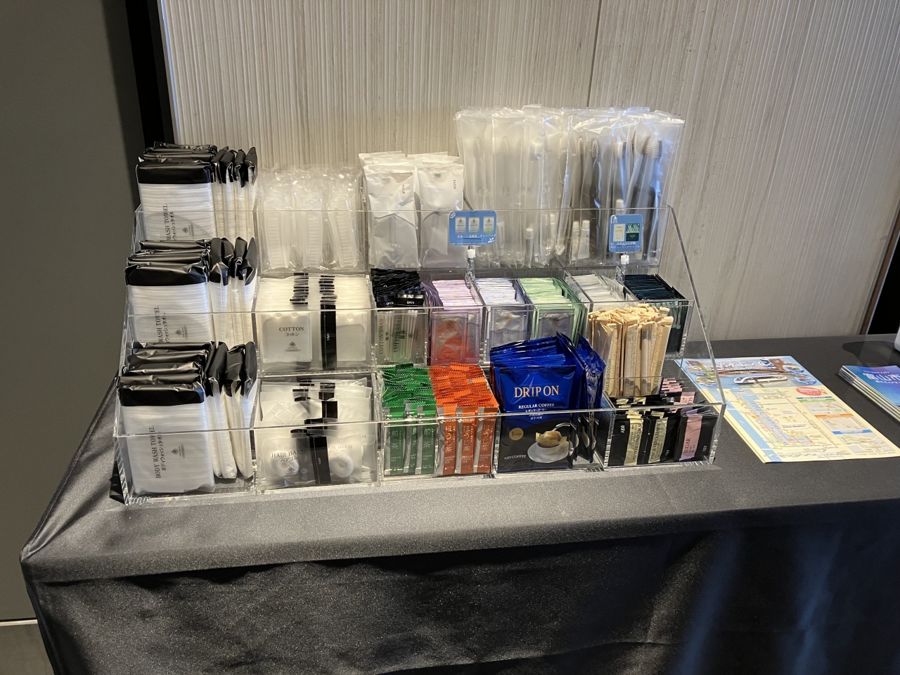 しかも、そのセキュリティのかかった扉の手前に、普通は客室に置かれていることの多い、お茶やコーヒー、女性用の基礎化粧品などが必要な分だけ持っていけるようになっていて、いろいろ合理的だった。部屋には館内着とパジャマが置かれていて、館内着で大浴場に行ったりホテル内をウロウロできる。部屋の窓は大きくて立山連峰がきれいに見えた。