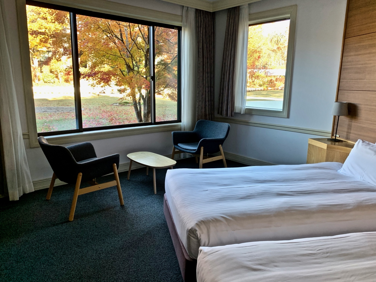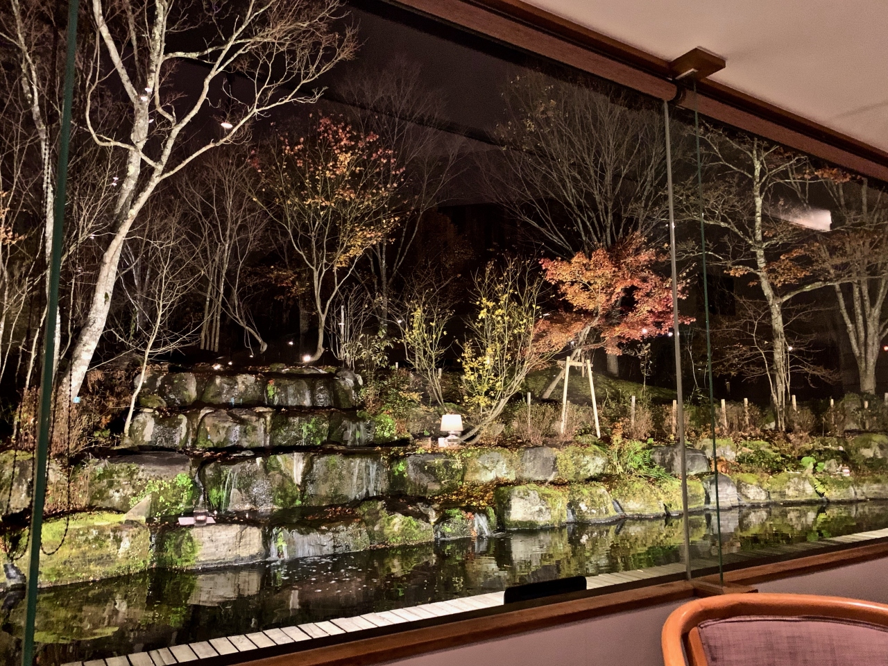 ホテルは自然の中に建っていて、特にレストランからの眺めは最高に綺麗でした。紅葉した木々や滝を模した景観にうっとりしながらのお食事でした。