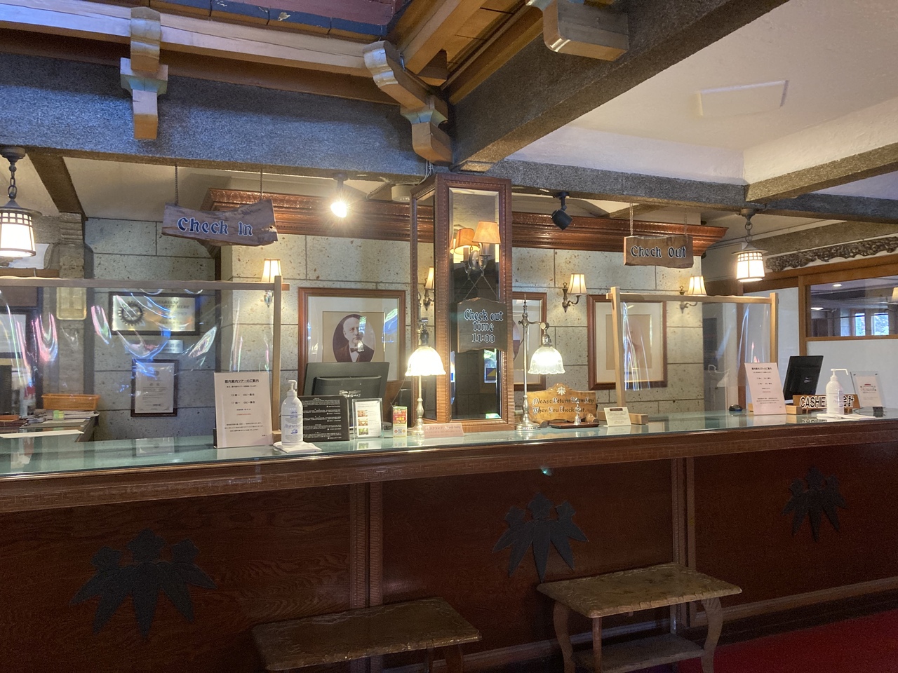 中は赤いカーペット敷きで高級感があり、フロントはレトロな雰囲気でした。