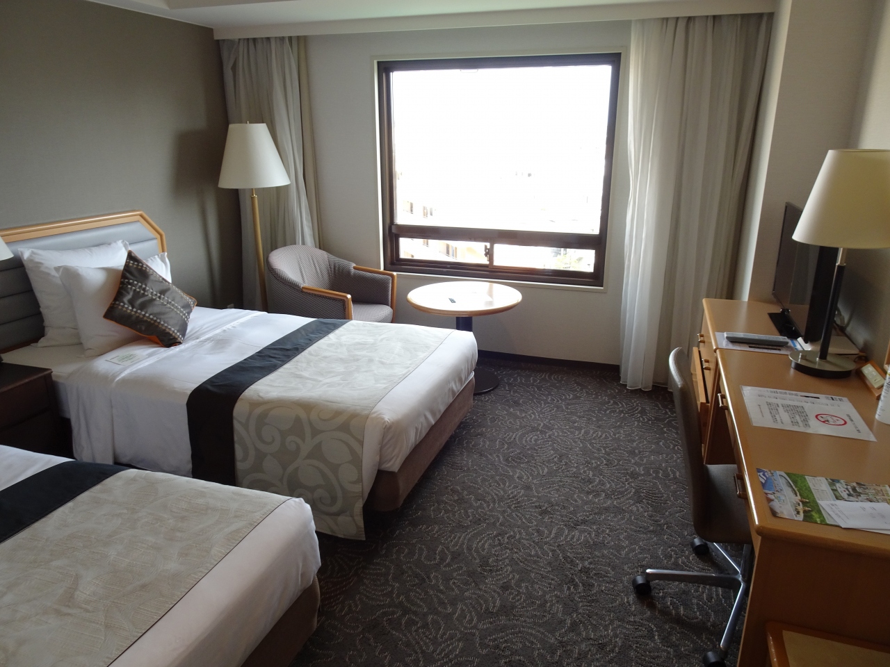 沖縄ハーバービューホテルは、県庁前駅と旭橋駅が最寄り駅になるのですが、少し距離があるし、坂を上って行くので、ちょっとそこはマイナスかな。ただ、今回は半分レンタカーを利用したので、玄関周りとか敷地の広さに余裕があって、そっちの方で十分プラス評価ですね。