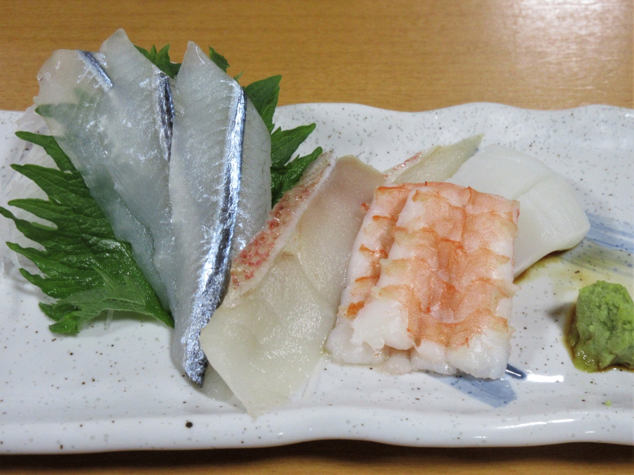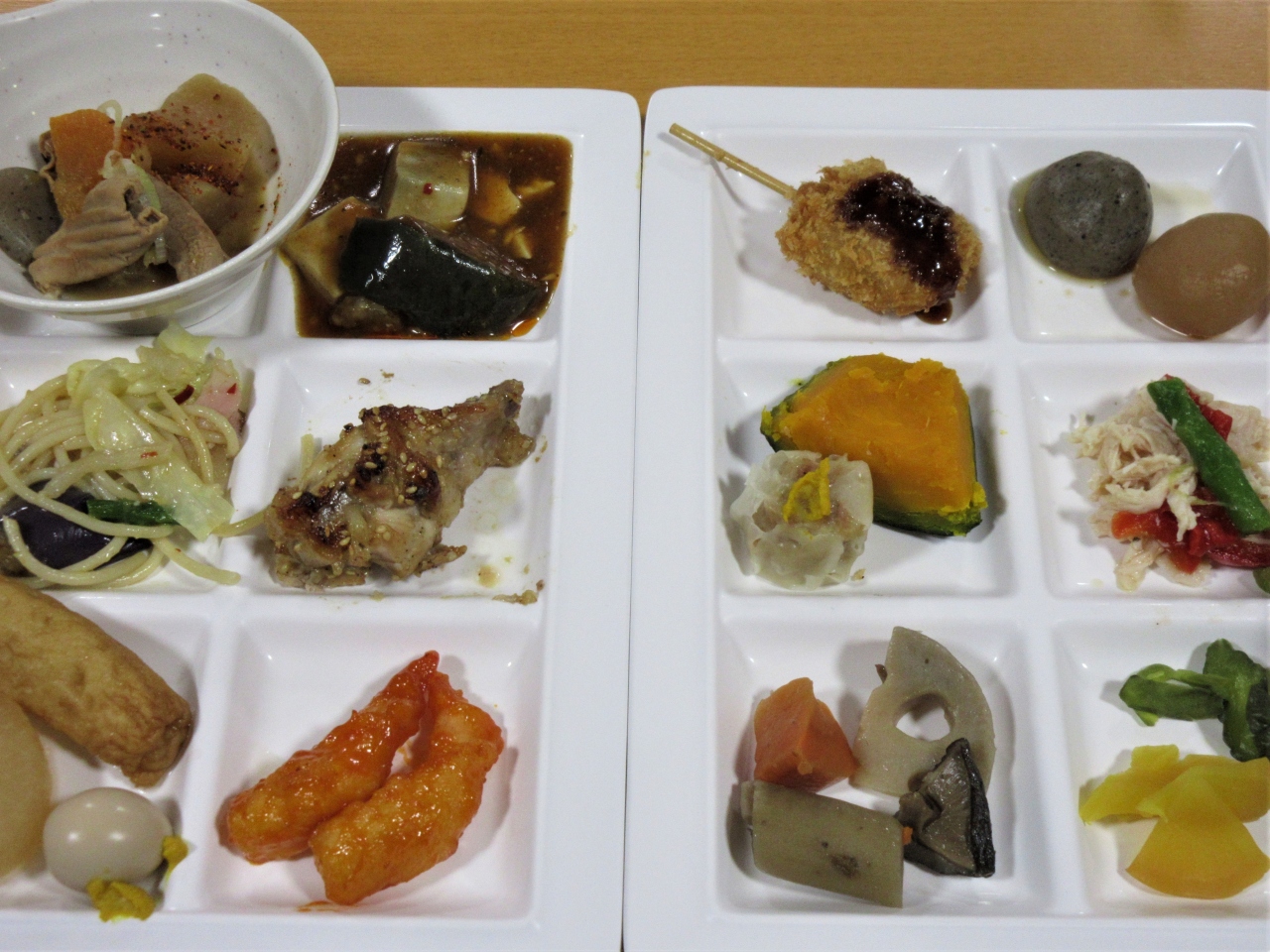 夕食は、ハーフバイキングで、事前に『牛すき鍋』『刺身4点盛り』がセットされています。他にバイキング料理が20種類くらいに、ソフトドリンクが10種類くらい。アルコールが1杯好きな物を飲めます。