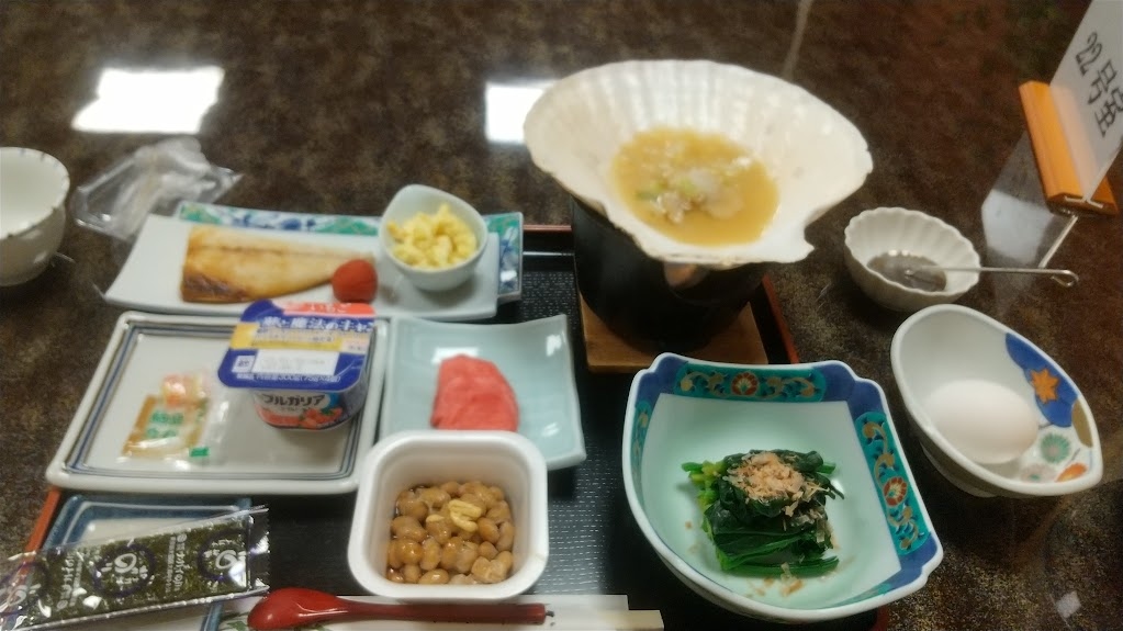 食事は1階の食事処でいただきますが、混雑していないので静かに楽しめました。朝食にはホタテ貝焼きが付き、食後のコーヒーもありよかったです。
