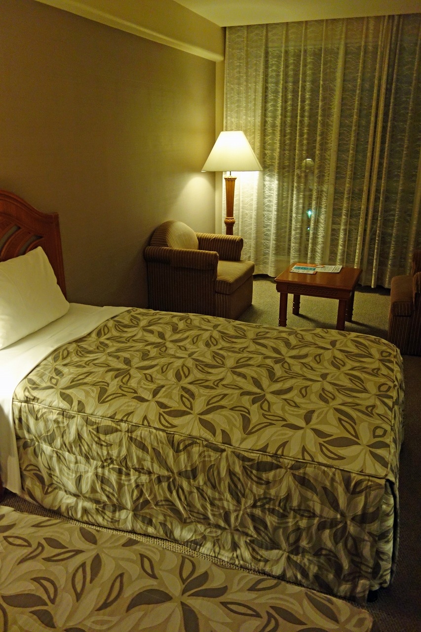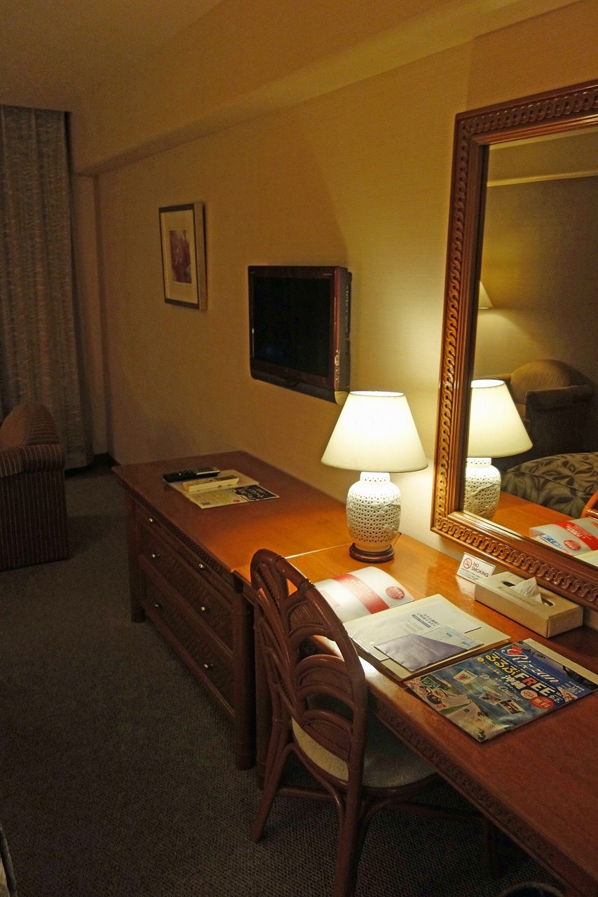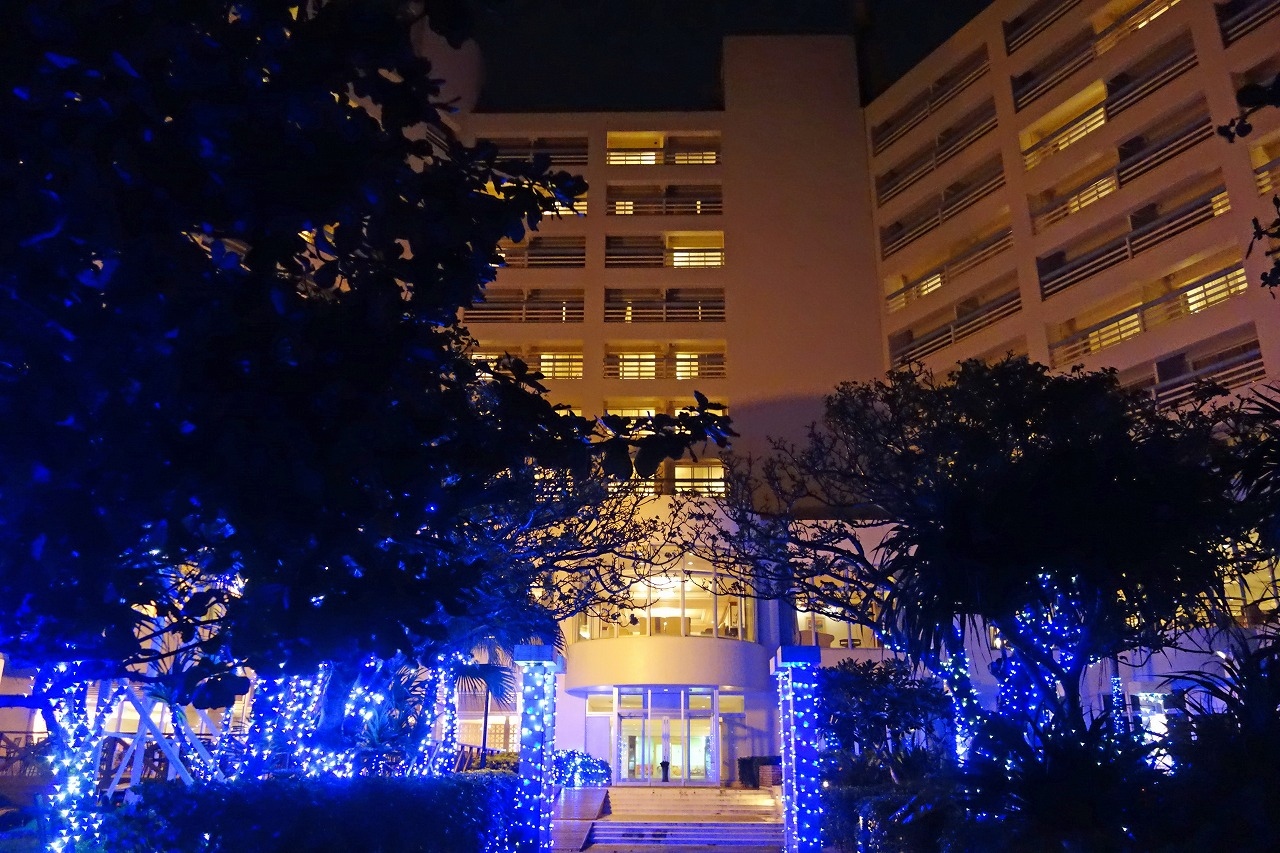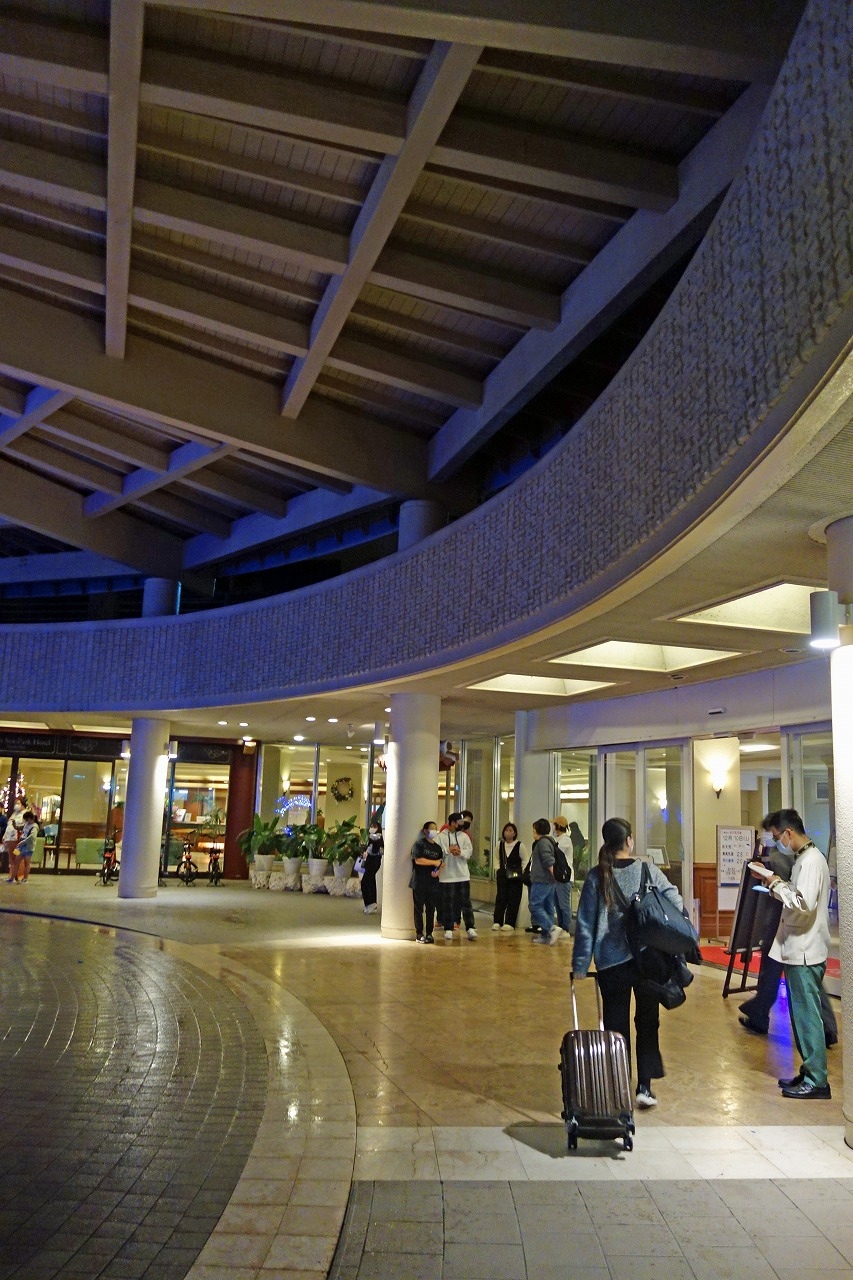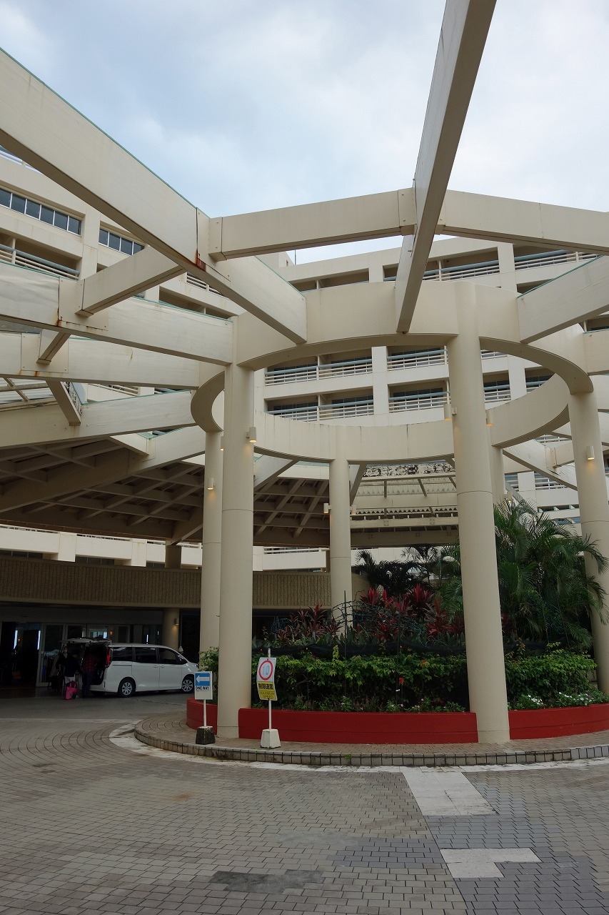 格安の4泊5日のツアーの1泊目で宿泊しました。ホテルはとても大きく部屋によっては朝食のレストランまで歩いて5分くらいかかります。シーズンによっては修学旅行生が多いと思われ、滞在時も4つほどの高校が宿泊していました。レストランなどは一般客とは別になっていて、混在することは無いのですが、お土産屋や館内のコンビニなどでは出会ってしまい、時間によってはレジなどが混雑しています。ツアーの夕食は館内の2つのレストラン化sらセレクトでしたが、あまりオペレーションはよくなく、30分ほど待たされた挙句に最初から開いていたテーブルでした。セルフのBBQの店なので厨房の混雑など無く理由が分かりません。入店のタイミングで分かりましたが、名前を伝えておくと部屋に戻るのであれば部屋に電話をしてくれ、携帯の番号を伝えると電話してくれるようです。そのような説明がなかったので馬鹿みたいに店の前に立っていることになりました。待合いの椅子もありません。ロビーで開催されるエイサーショーも店に並んでいて見ることが出来ませんでした。ただBBQのお肉な料理は美味しかったです。部屋は残念ながらパーキングビューでしたが、夜になってからの到着だったので気にはなりませんでした。ホテルはオーシャンフロントなので、表に出ると砂浜が広がっています。沖縄らしい風景を楽しめますが、高校生がたくさんいました。朝食のレストランは巨大なのですが、お客の数が多いと入り口で待つことになります。料理はどれも美味しかったです。食後はデザートとコーヒーを持って表のテラス席でいただきました。