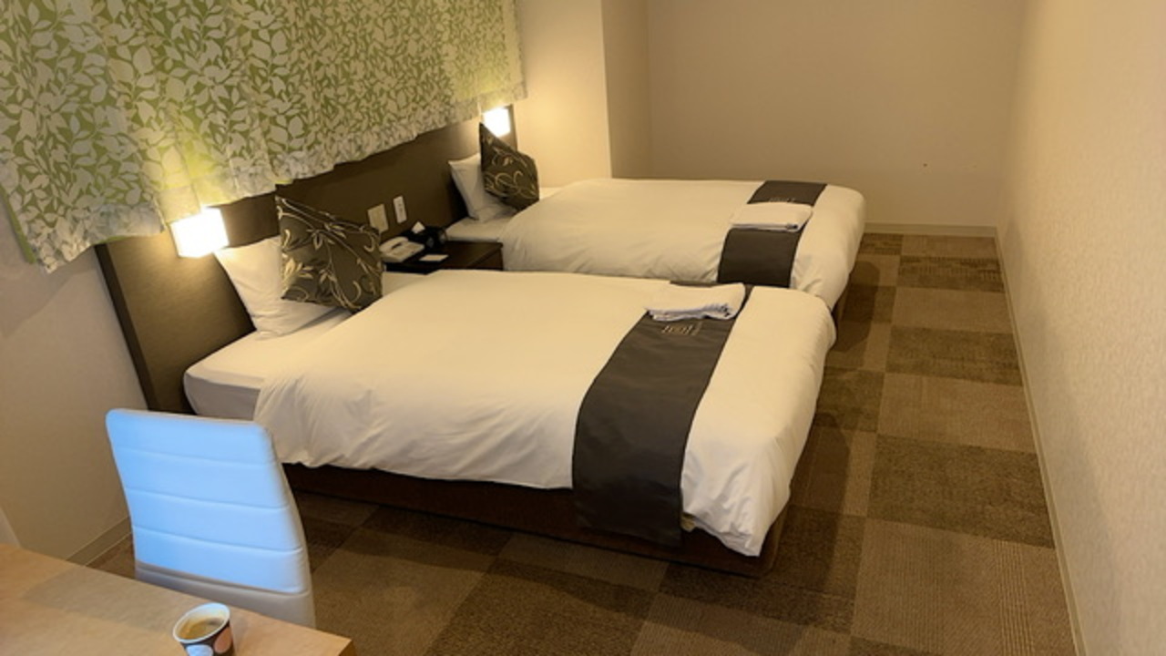ツインの部屋はまずまずの広さ、机と椅子もあります。