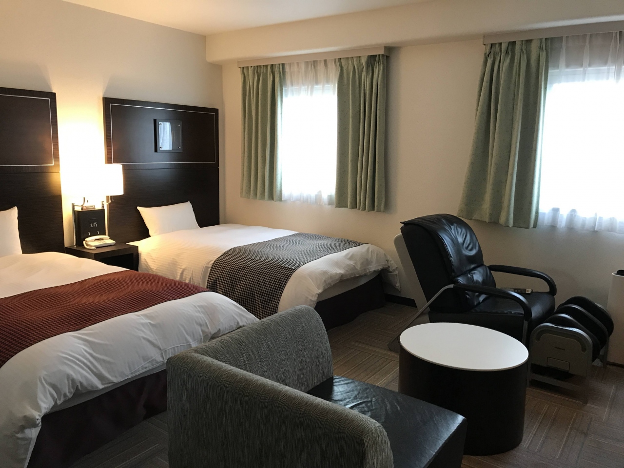 ハーモニーランドの後泊に利用しました。北九州空港の近くにはホテルがいくつかあるうちの一つです。マッサージチェアがある広めなデラックスツインに、小学生添い寝で無料朝食つき合計16000円で泊まりました。意外にも子どもにマッサージチェアが好評で家族で取り合いになってしまいました^^; お部屋も広めでゆっくりできました。古いマンションのような作りで、室内のユニットバスへの段差が大きめで要注意です。