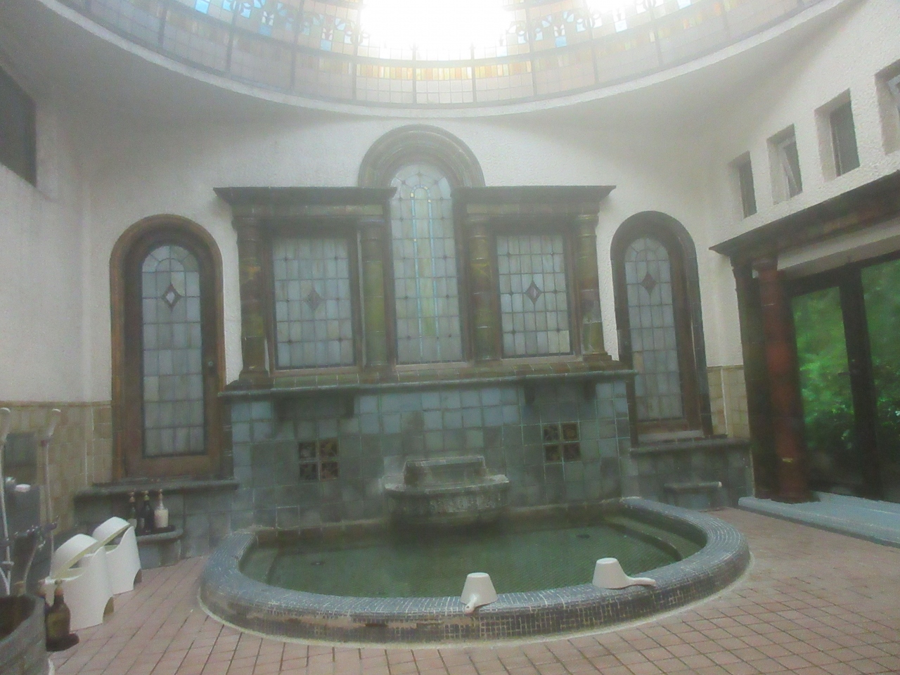 洞窟風呂は、宿の建物の裏手にある崖の本当の洞窟、奥が深くて弁天様が祭られています。ここになみなみと湯が張ってあって、自然の湯をありがたく楽しめます。もうひとつのローマ風呂は、古代を彷彿させる精巧なステンドグラス作りで、目も楽しませてくれます。お風呂が楽しみな宿でもあります。