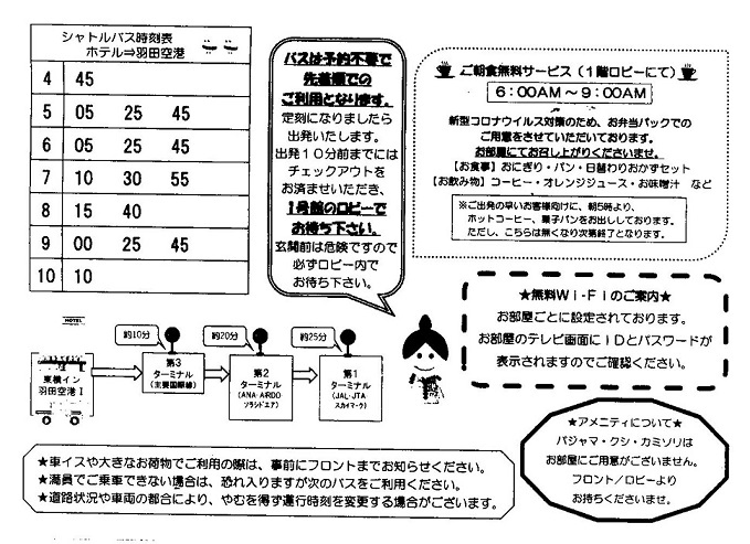 羽田国際空港まではそう遠くないのですが早朝の便なので前泊するようにしました。アクセスは京急空港線の大鳥居駅からほんの数分でとても便利なところにありますね。空港までの無料シャトルバスもありこれも便利で以前利用した時は予約したのですが今回は不要で数名の乗車でしたよ。早朝出発なので朝食は頂けませんので近くのコンビニでパンを購入です。気になったことは室内の冷蔵庫の開閉扉が逆での操作に違和感を感じましたね些細なことですが。ご利用くださいね。