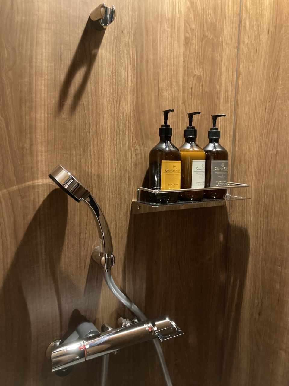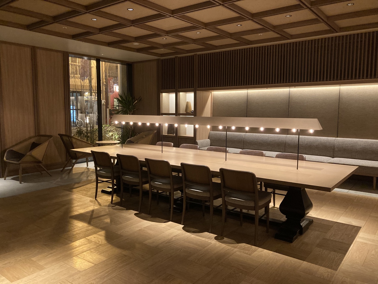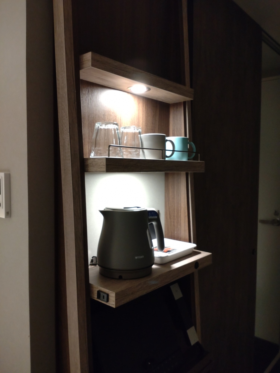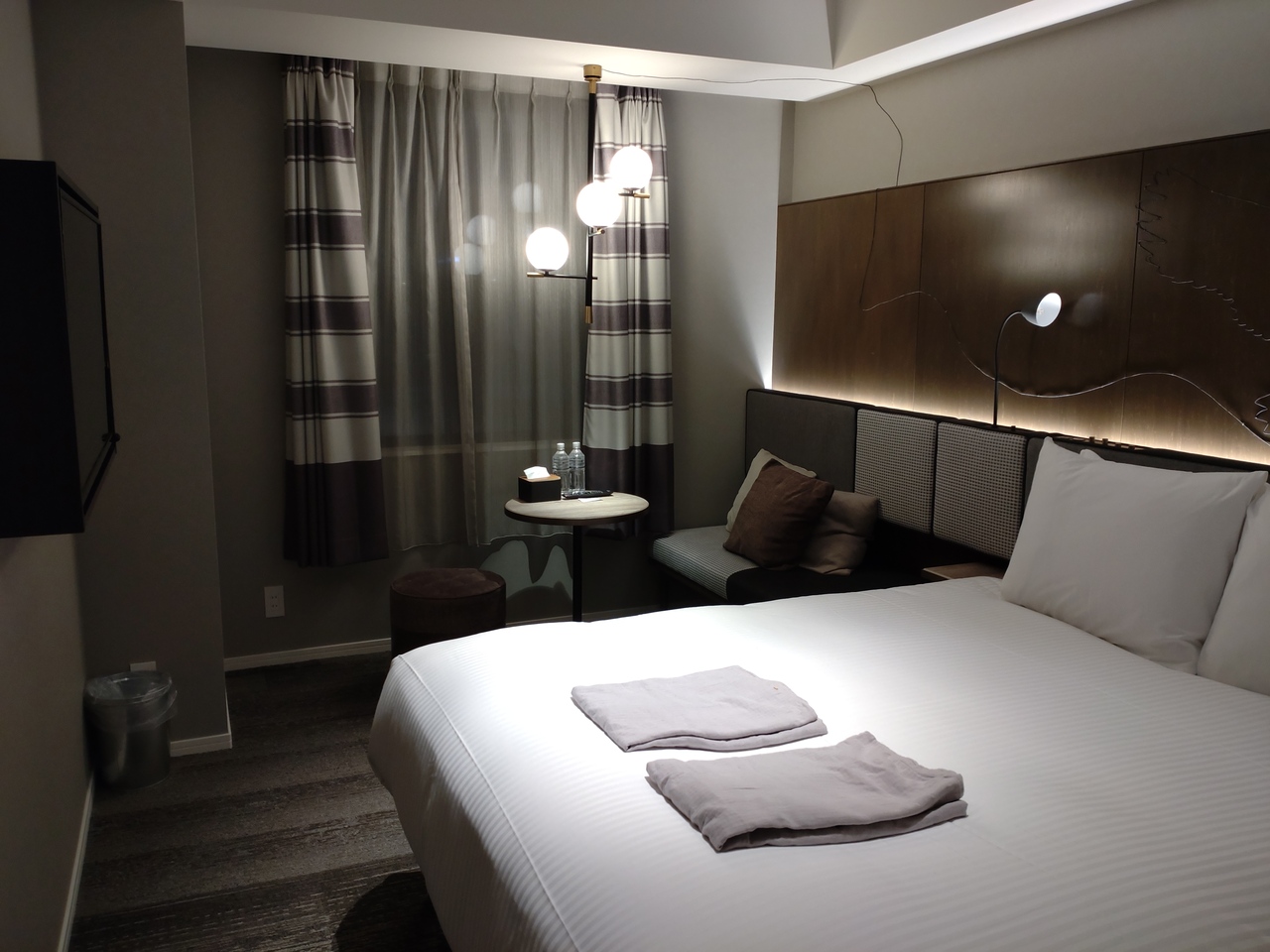 広々としたロビーは、天井の高さと木材を基調とした壁、品のある調度品で、ビジネスホテルにはない優雅さを与え、椅子や机もオシャレに見えてしまいます。廊下の天井も高いところは、古い建物にはない優位点。シングルルームはなくダブルのシングルユースの設定からなので、ダブルルームに宿泊。グレンチェックを基調にした部屋はなかなかのデザイン(こういったところは通販大手の経営だから?)。間接照明のワイヤーがアートになっていたりと遊び心も。カップやポットの置き方もなかなかです。ベッドサイドには、最近のホテルでは必須のUSBポートとコンセントを完備。ただし、丸テーブルとソファのみは、くつろぐだけなら良いが、ビジネスユースにはいただけない。パソコンを使いづらい。ここは本当に残念。バスタブがないので水回りはコンパクト。大浴場があるので困りません。ただし、シャワールームに鏡がないのはマイナス。