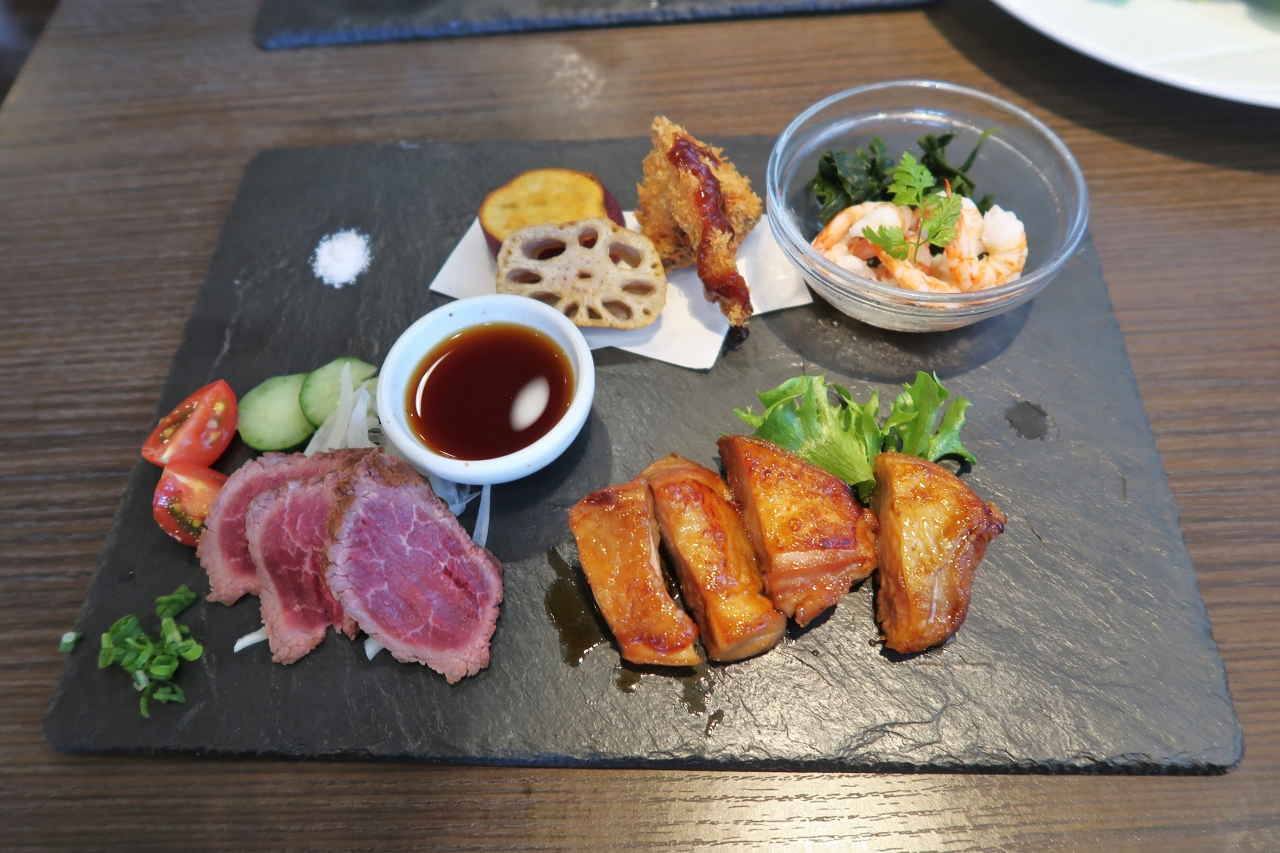 ホテルサンルート徳島には、和食、洋食、中華それぞれのレストランがあります。全国旅行支援の地域クーポンを使えるお店になっていたので、ランチタイムに1階にあるBar&Cafe炭火焼ドン・ガバチョを利用しました。観光客向けのメニューだと思われる阿波プレートランチをいただきました。阿波牛の希少部位の炙り・和田島の小エビ・神山産極椎茸フライ・鳴門金時、鳴門蓮根の素揚げ・阿波尾鶏もも炭火焼きと、徳島食材にこだわったお得なランチでした。