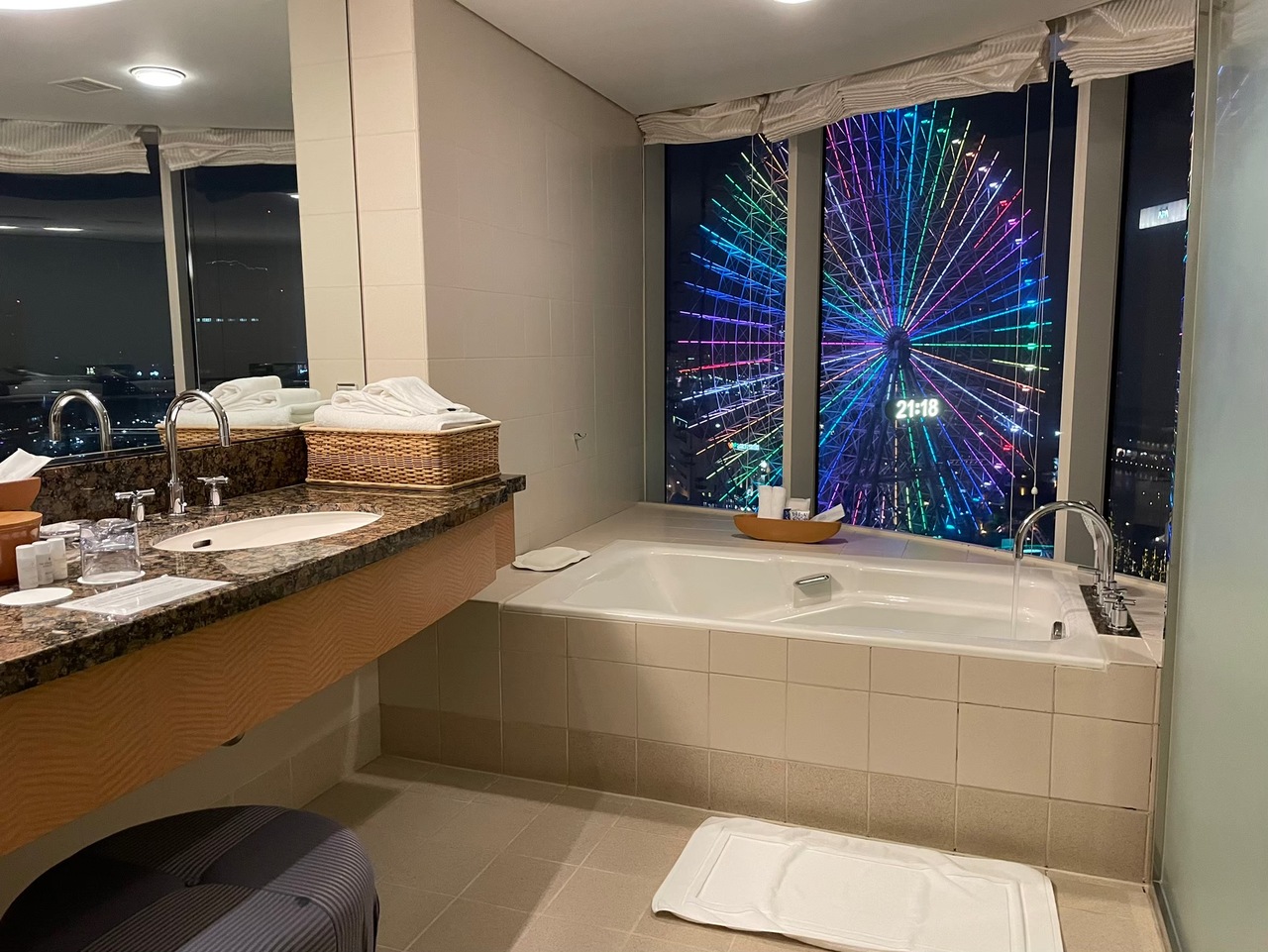 今回はパークビューのビューバスだったので、お風呂に入りながら夜景やコスモロックのイルミネーションが見れました。
