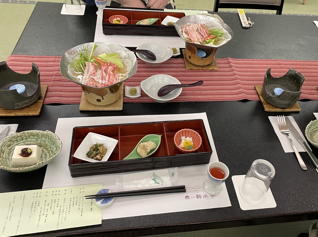 お食事は朝食夕食共に2階の食事処「春涛」で。品数も豊富で盛り付けもきれい、美味しくいただきました。特に夕飯の選べる焼き物の「鮑の陶板焼き」は小ぶりながらとてもおいしく素材の良さを感じました。「鰻の蒲焼き」はかごに見立てた器が素敵!