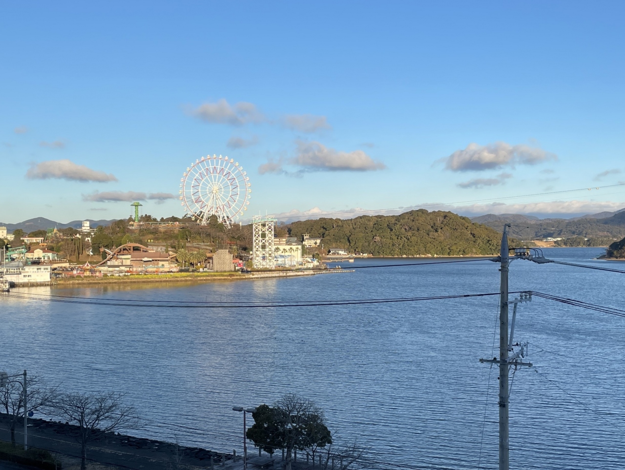 お部屋の窓からは目の前に浜名湖、その向こうに遊園地パルパル、それに大草山のロープウェイまでよく見えました。