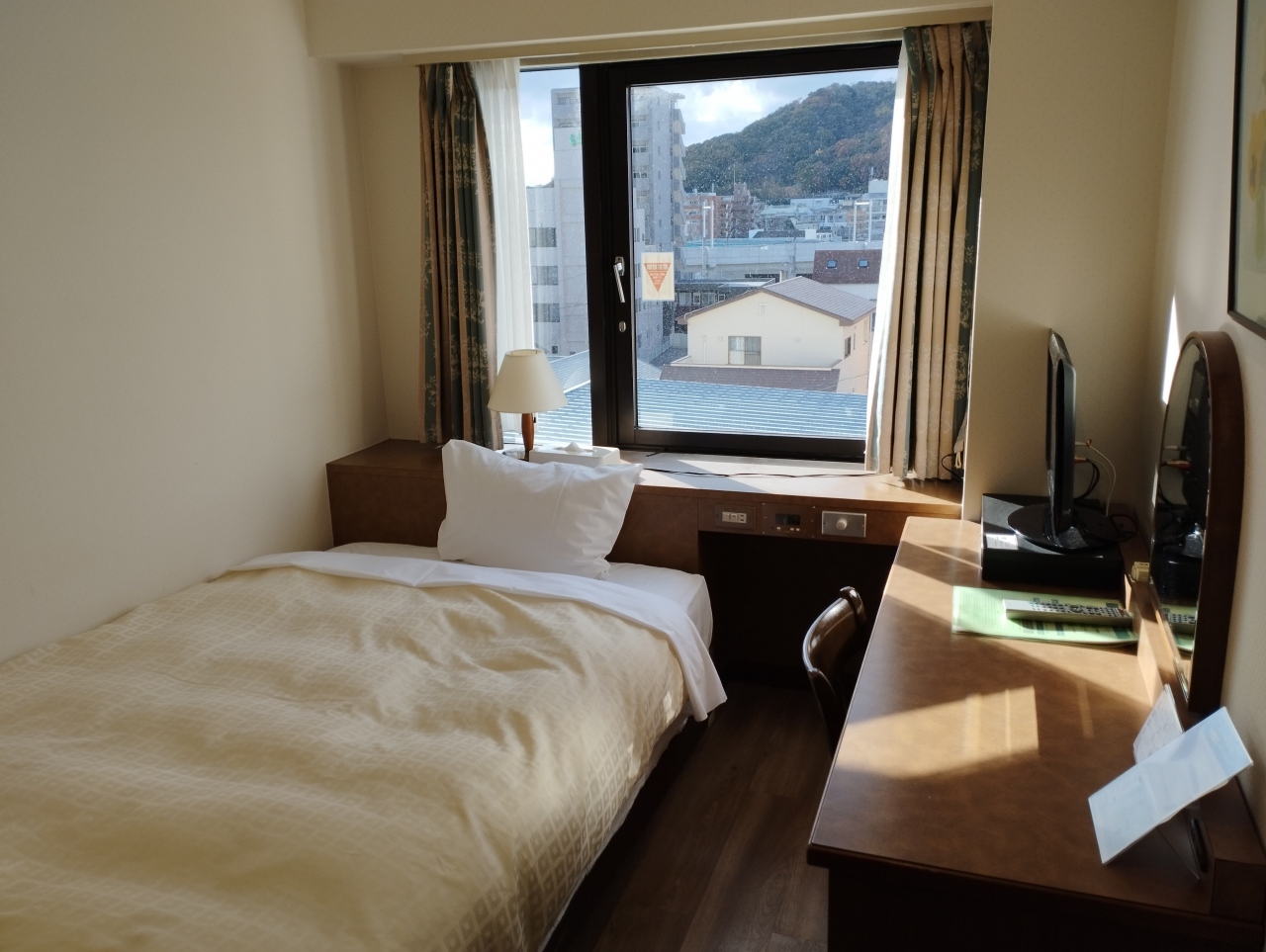 - 部屋タイプ:シングル14㎡ 130cm幅ベッド バス、トイレ付、朝食バイキング付~平日夕食カレー付 大浴場あり(備長炭の湯)