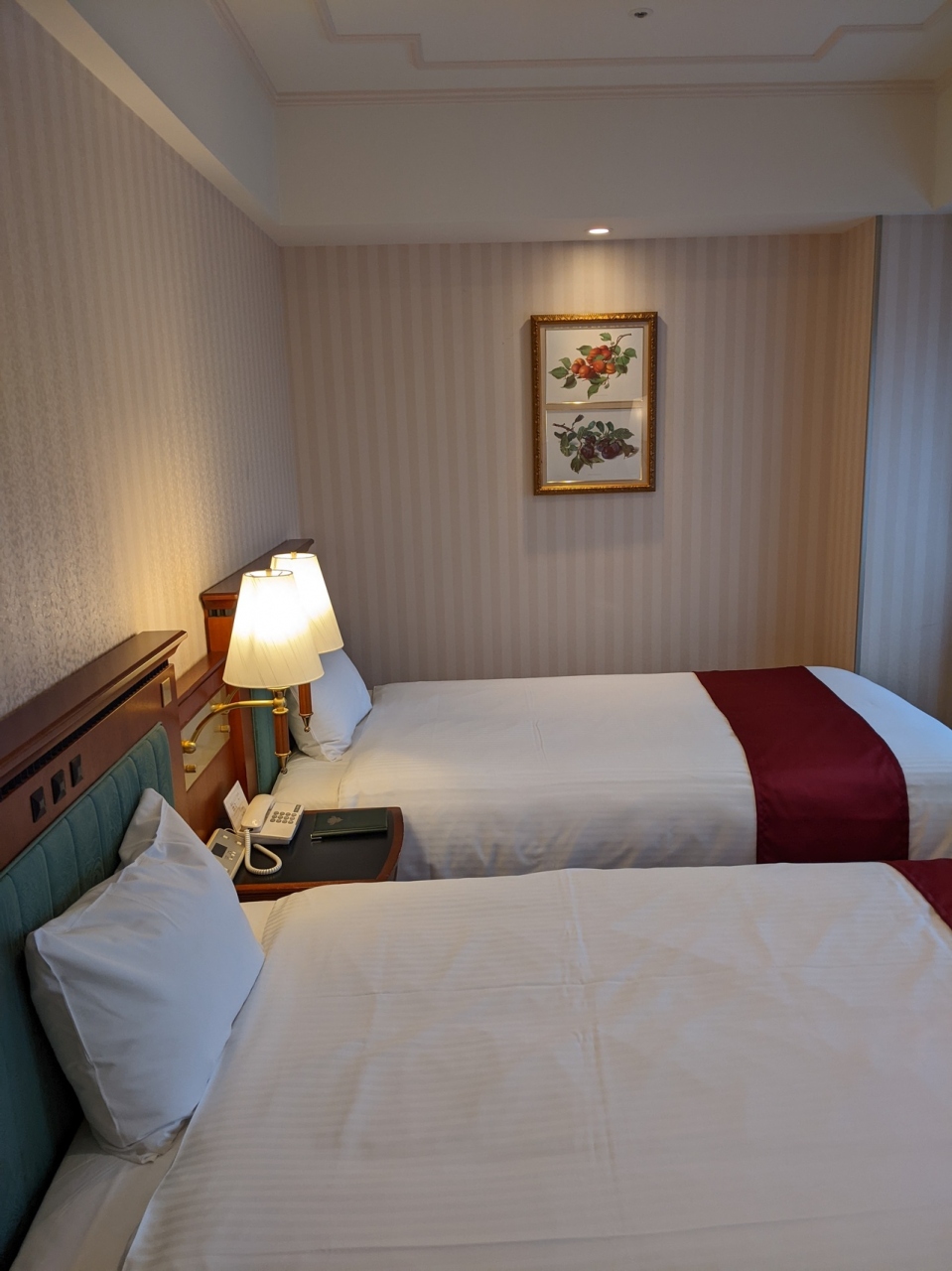 体調的に愛知芸術文化センター近くの宿に泊まりたく、ちょうど名古屋割と全国旅行支援で手の届くお値段だった為にお世話になる事にしました。申し訳ないくらいのお値段でした。綺麗なエントランスに礼儀正しい接客。Theホテルでした。荷物もチェックイン前に預かって貰えて助かりました。ツインしか取れなかったので、広くて部屋も豪華で。玄関→クローゼットスペース、ここからバスルーム→扉があって部屋。広すぎて最初暖房調節が上手く出来ませんでした。枕元にコンセントは無いですが、延長コードは用意してあったりします。ビジネスホテルでは無いからかWi-Fiに鍵は無いタイプでした。
