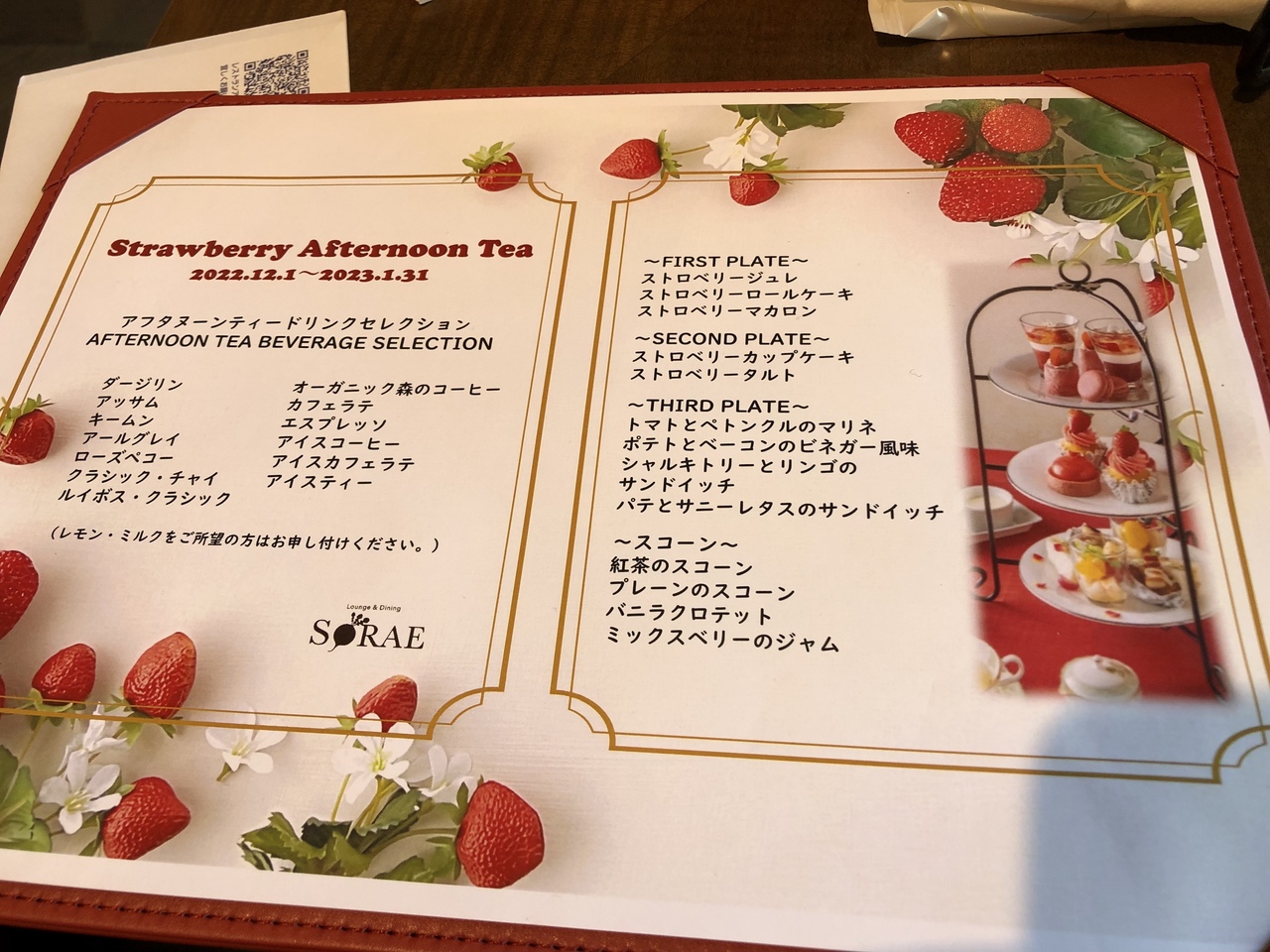ホテルの2階のレストランSORAEで楽しんできました。アフタヌーンティーは 好評で 期間が延長となり二月も 開催。