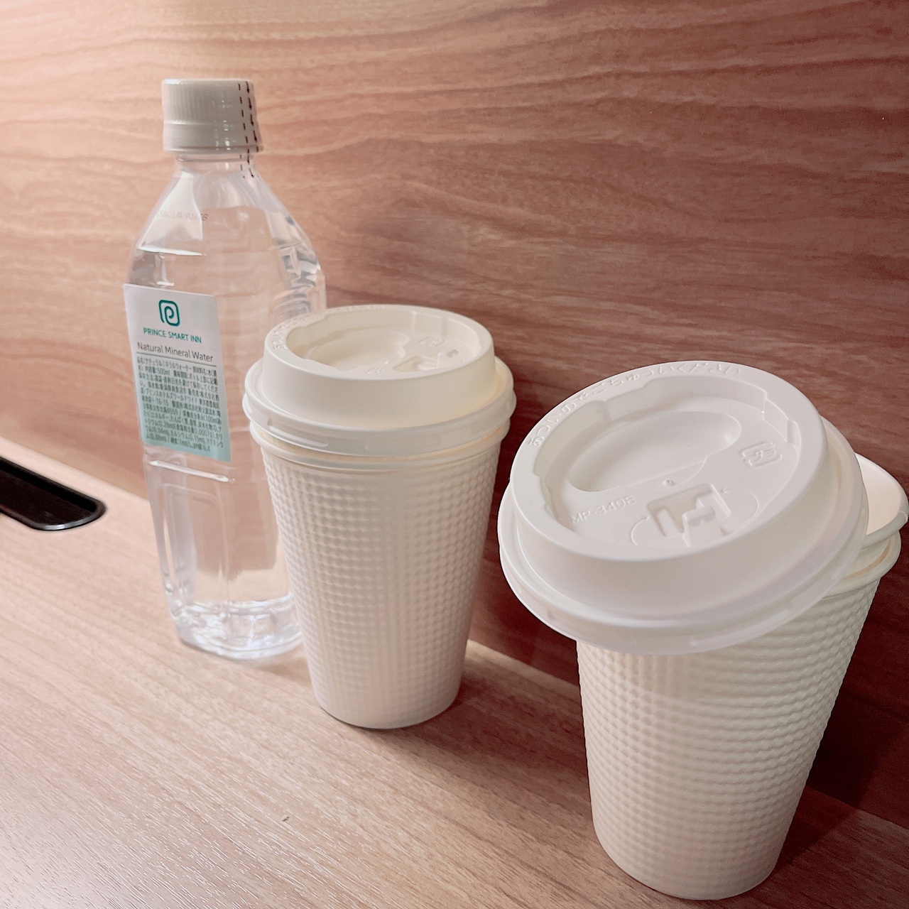 客室内もコップは紙コップ、湯沸かしポットはあるけど飲み物系はお水のペットボトルがおいてあるだけ。