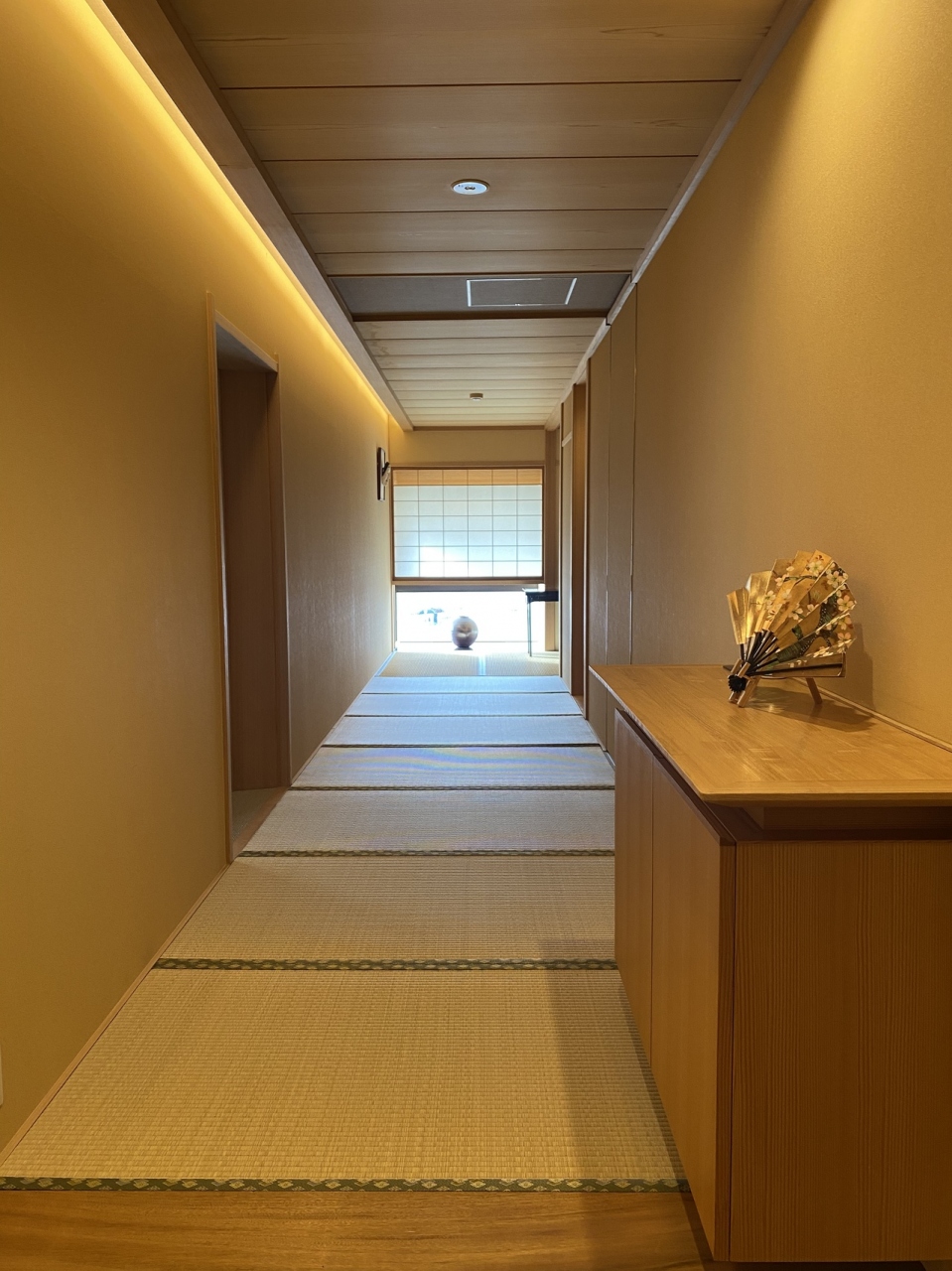 松月のお部屋は、入ると長い畳廊下があり、途中にベッドルームがあります。