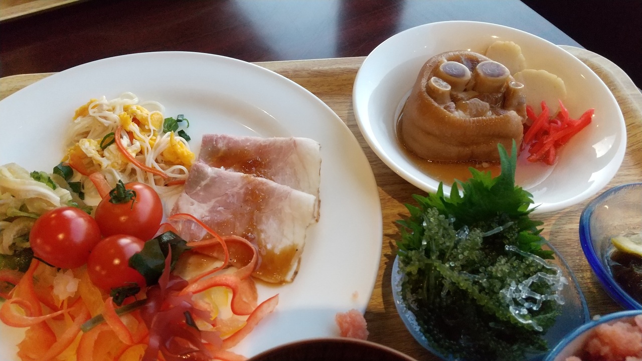 新鮮なマグロ、海ぶどう、辛子明太子、アグー豚のハムは定番メニューで朝から海鮮丼や手巻きにしていただきました。