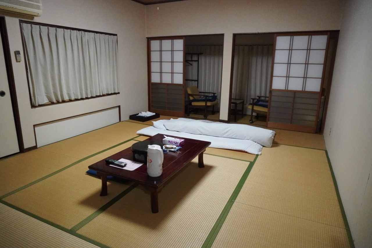 一福旅館は、恩湯もすぐの長門湯本温泉の中心部。旅館が軒を並べる川沿いですが、はっきり言えば外観は周囲と比べるとちょっとチープかな。家族でこじんまりやっている旅館といったところでしょう。ただ、部屋はシンプルですが、がらんとしていて余裕の広さ。朝飯も和食ですが、割とおいしいと思いました。