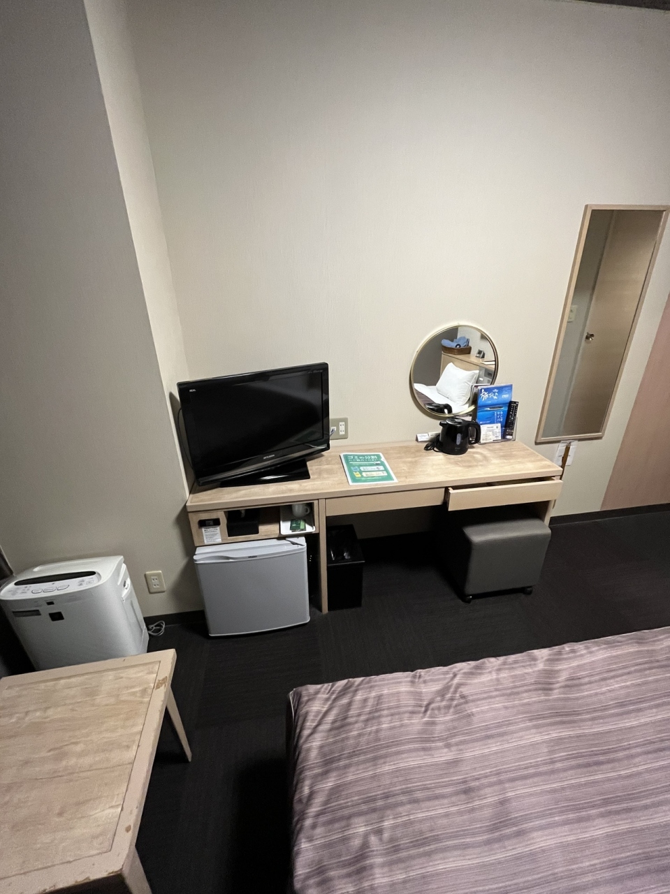 ベッド中央が少しヘタれてました。エアコンは温度調整できないタイプでした。ナイトウェアは上下ありで快適でした