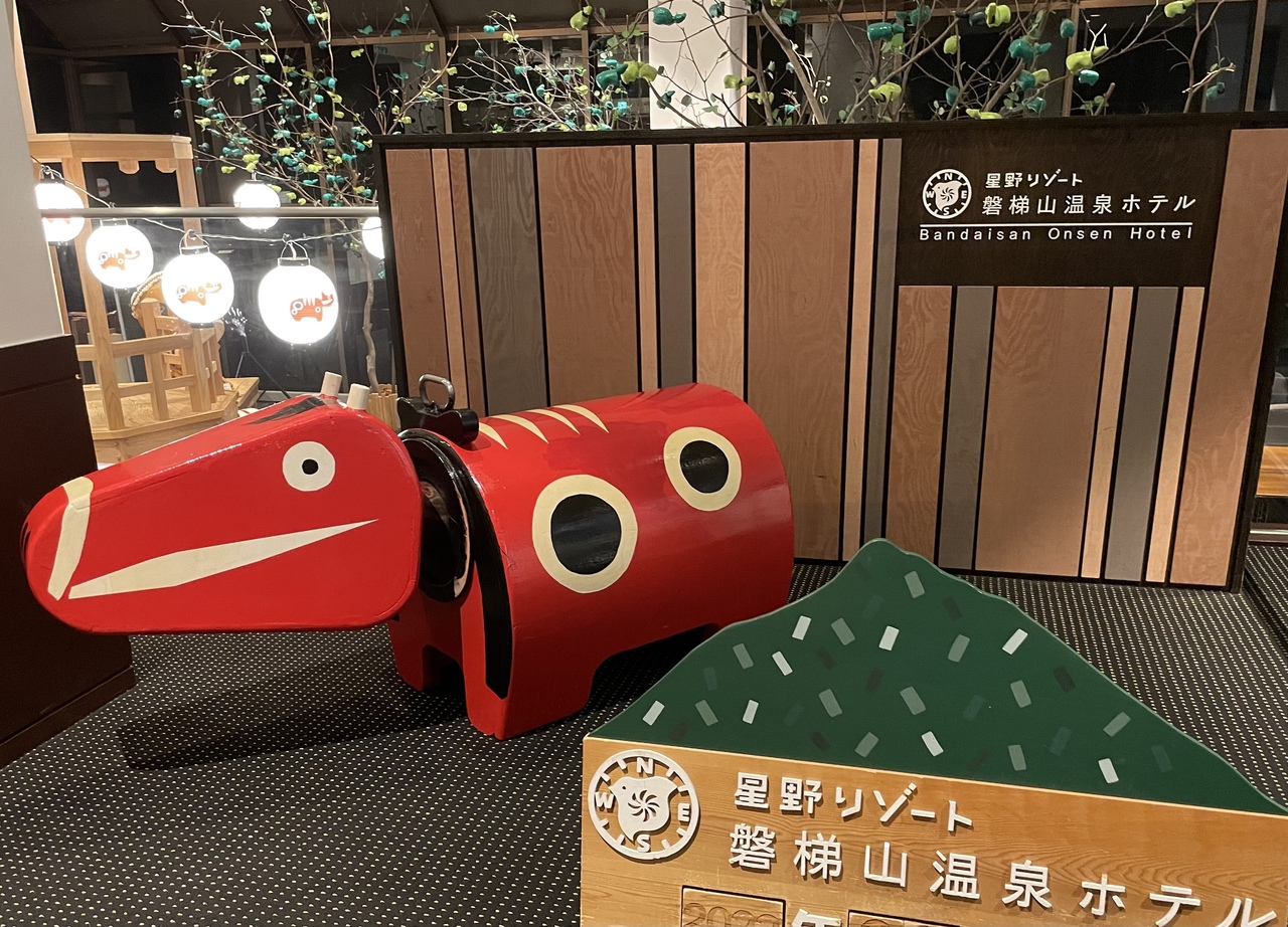 ホテルに赤べこが沢山あり、テーマパークを感じさせるホテル。
