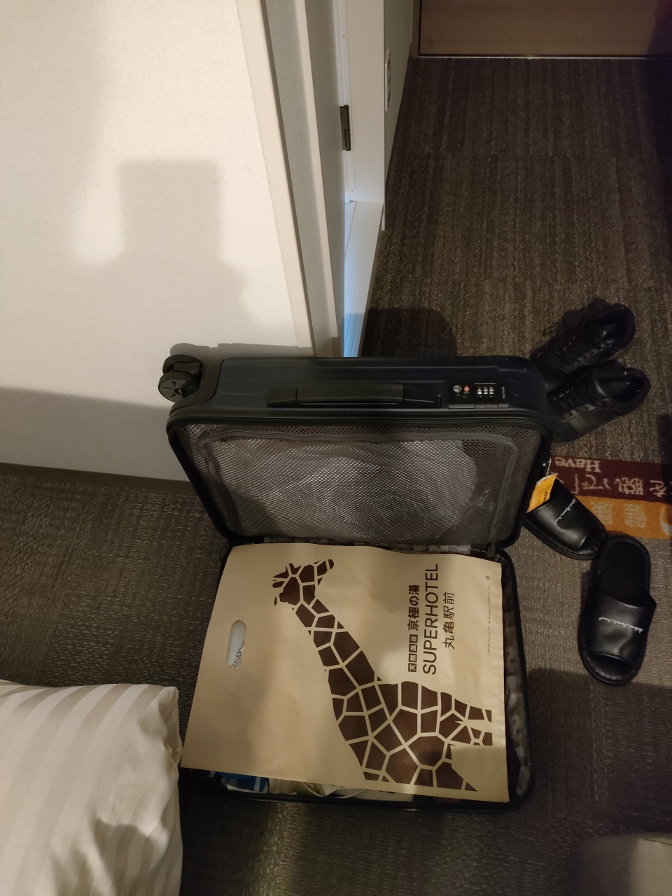 部屋はとても狭くキャリーケースを壁に立てかけることになりますが、歩行に障害のない場所で広げるスペースはありませんでした。そのため投稿写真のような歩行スペースに広げる羽目に・・・・