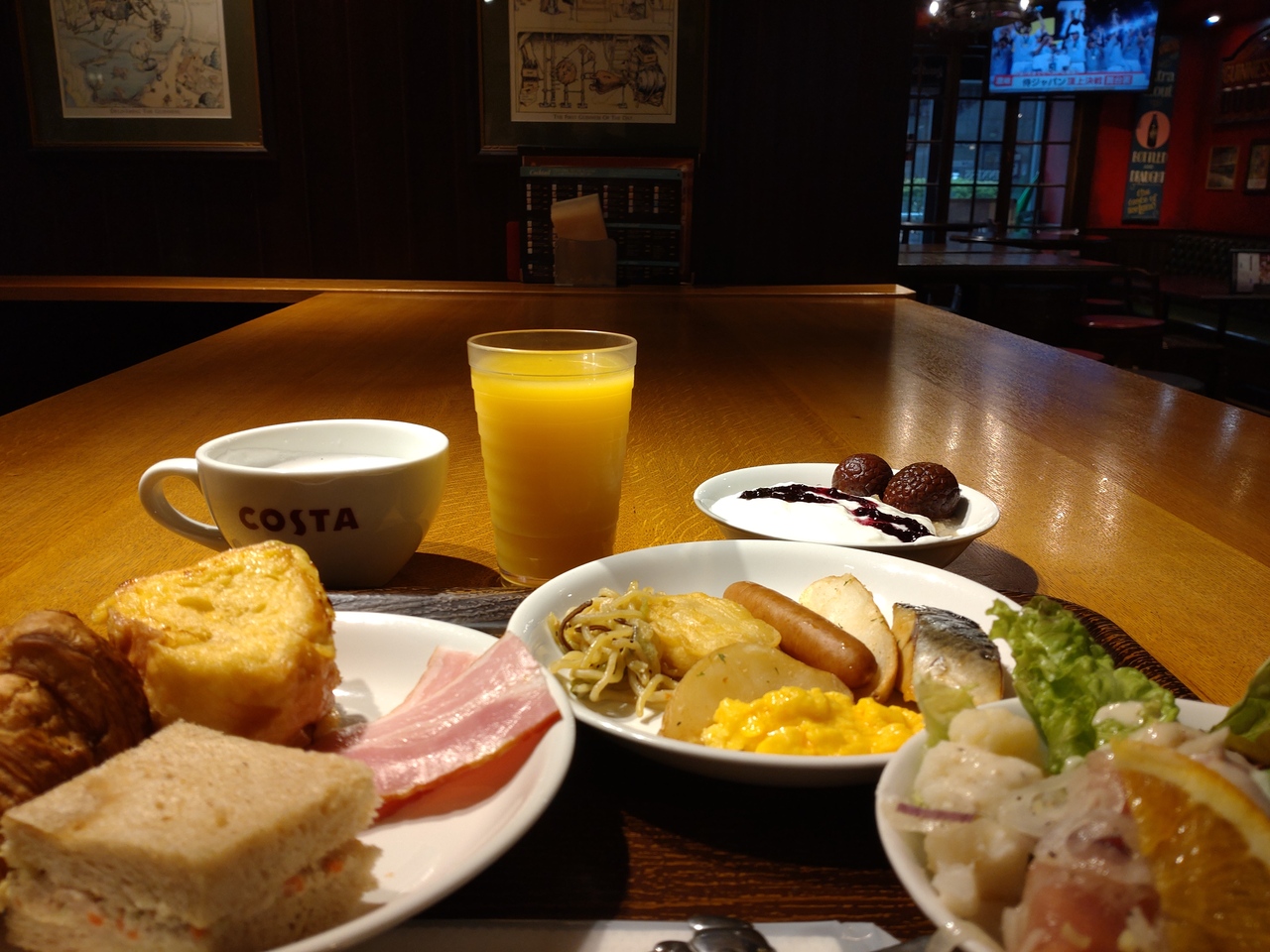 出張で初めて泊まった変なホテルです。一人でしたがハリウッドツインの部屋が空いていたので泊まってみました。ソファと丸テーブルがありましたが二人で泊まるには狭すぎます。誰がここに座るのでしょう? なお、この部屋にLGスタイラーはありません。コンチネンタルブレックファーストと聞いていましたが、いえいえ温かい料理が多くて朝食は満足でした。