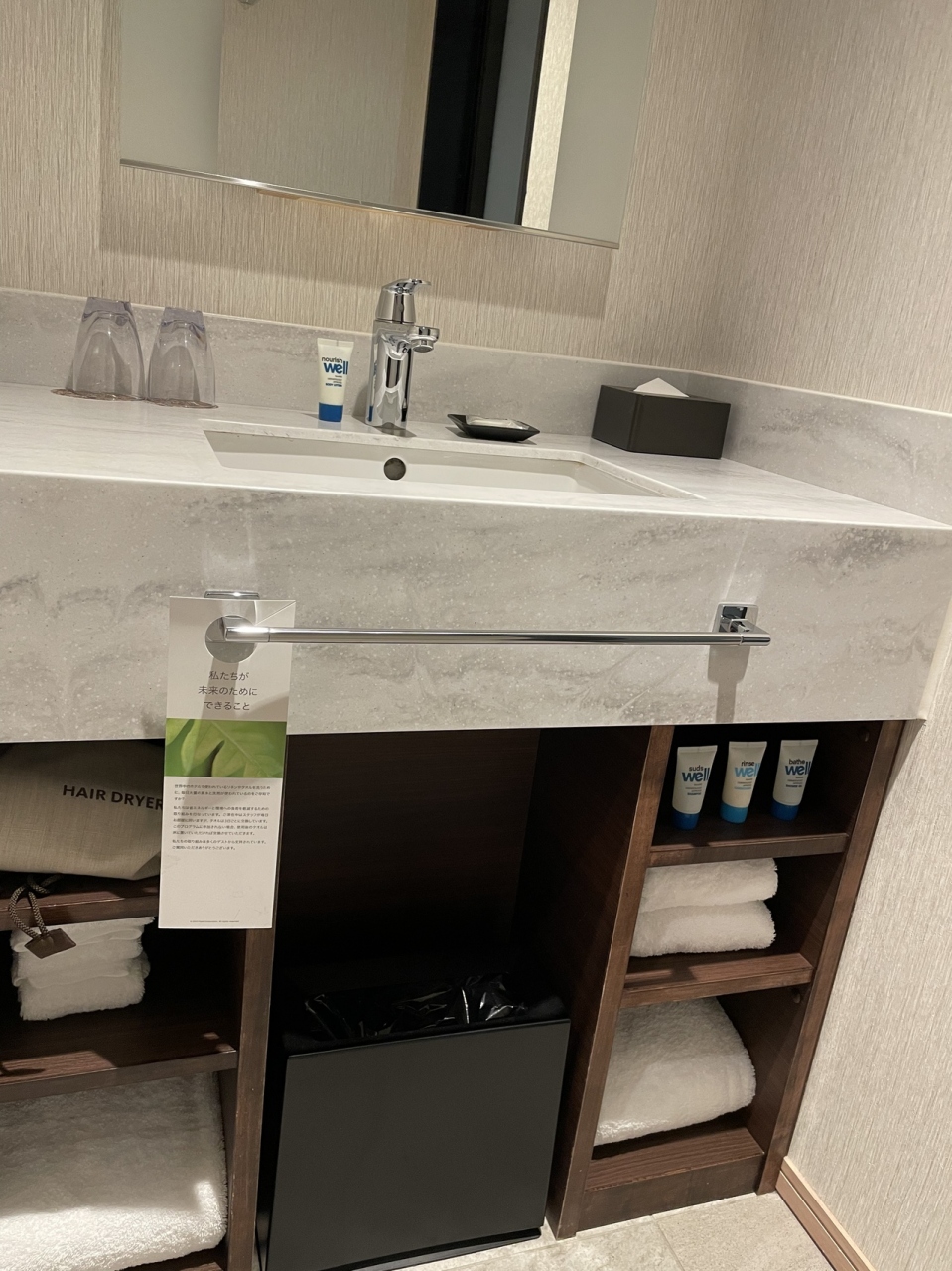金沢駅すぐの新しいホテルです。私は1泊のみで普通のお部屋でしたが、キッチンの付いたお部屋もあるようです。環境に配慮した長期滞在向けのようで、例えば、電子レンジがあったり、無料提供のお水を飲み終わった後は、ボトルを捨てずに水筒に使うような案内がある感じです。そのせいか、スリッパがありませんでした。フローリングで硬い床なので、スリッパがあると嬉しかったかな。室内は新しくてとても綺麗です。