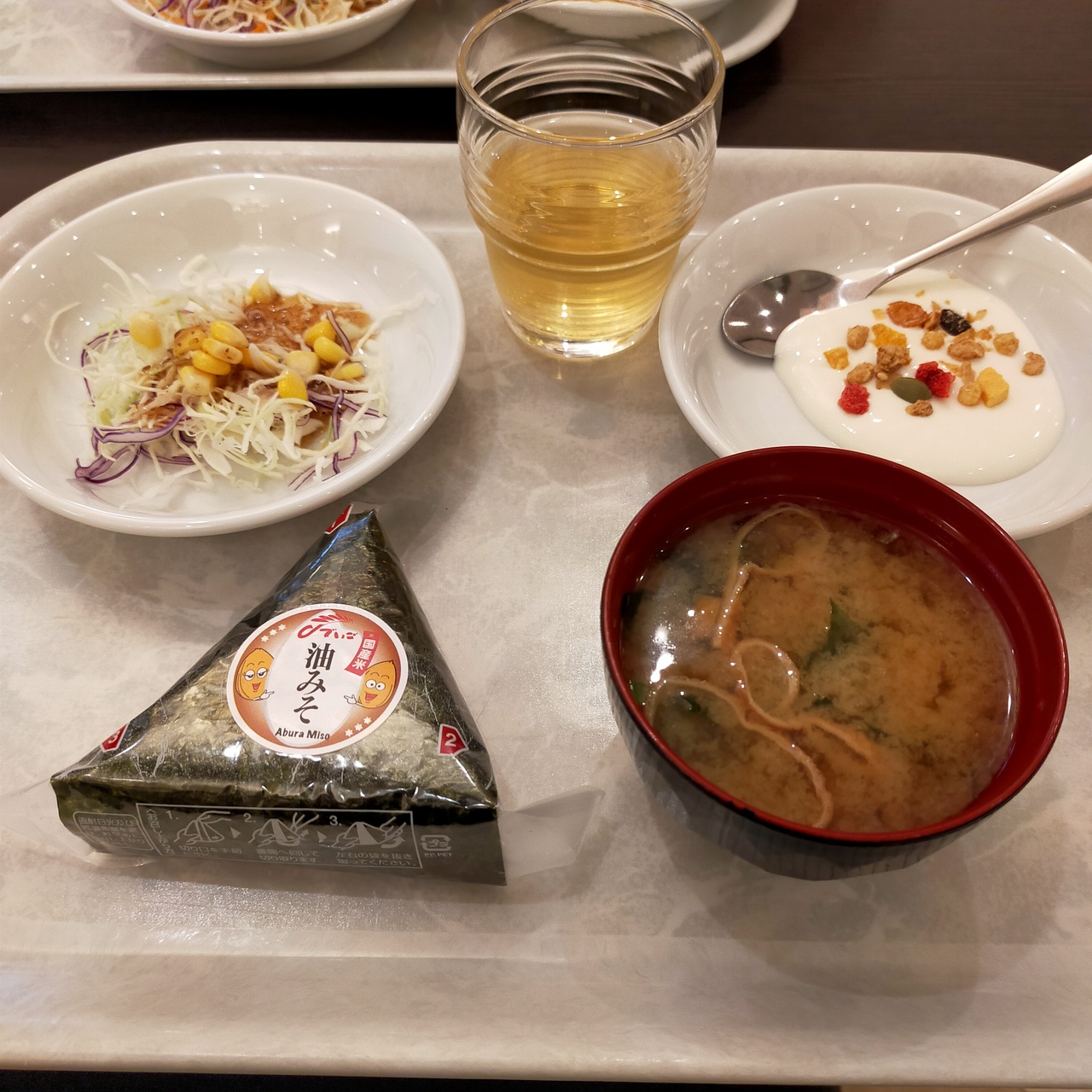 朝食は軽食と記載の通り、おにぎりやパン、あと、少しだけサラダとヨーグルトもありました。飲み物は普通にいろいろありました。