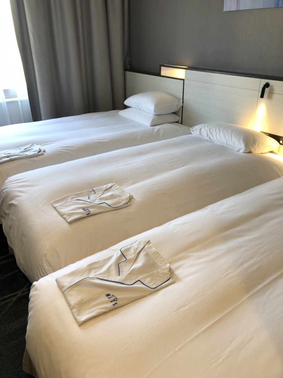 少し狭かったですが、トリプルなので仕方ありません。可もなく不可もない綺麗で清潔なホテルでした。駅が見える側の部屋だったので、電車好きな人にはいいと思います。
