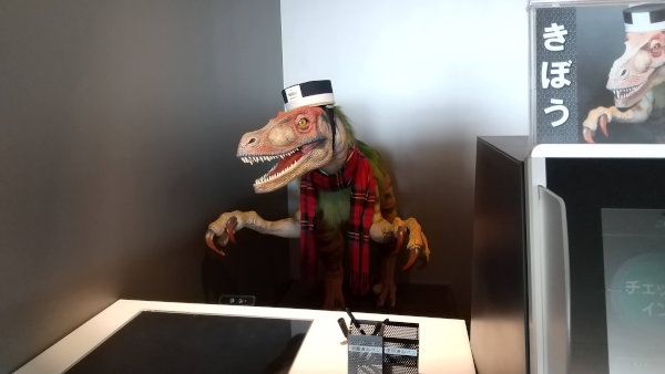 チェックイン・アウトとも無人(恐竜などのロボット対応)ですが、案内する人はとりあえず一人いました。