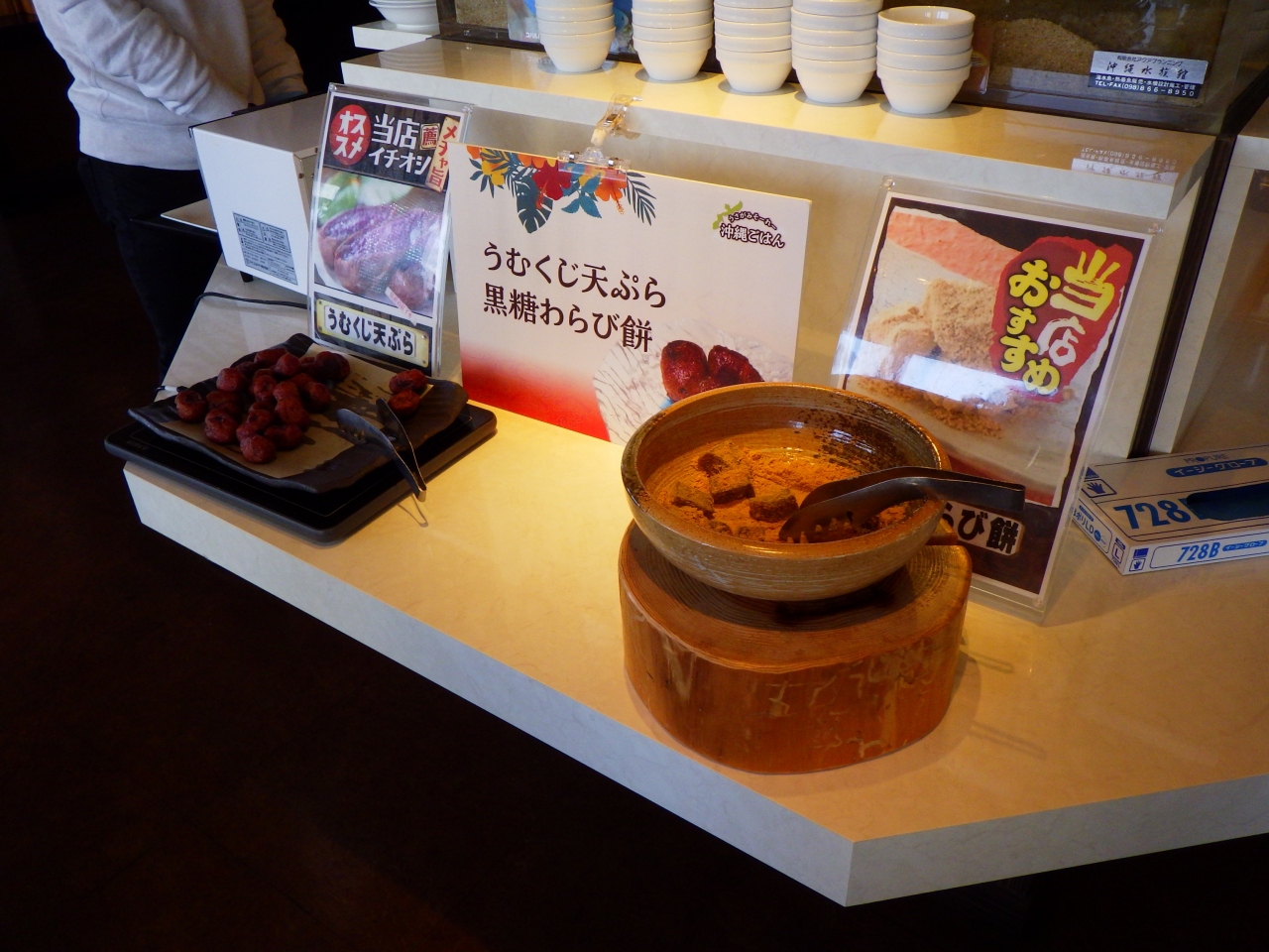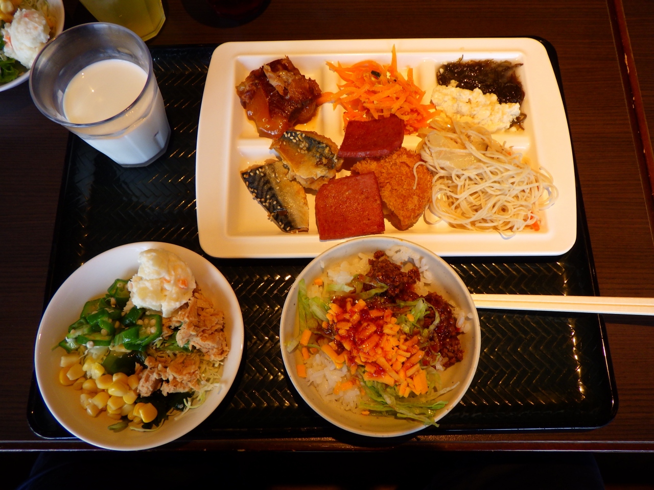 ホテル最上階での朝食ビュッフェ、沖縄料理の種類が多くて、どれも美味しく楽しめました。もずく酢、人参しりしり、SPAM、沖縄そば、タコライス、麩ちゃんぷるー、ゆし豆腐、うむくじ天ぷら、などなど。一日目と二日目で、少しメニューが入れ替わっているのもウレシイです。テーブルが小さくなく、通路がひろめ、熱帯魚の水槽があり、二日目は、窓際のカウンター席で食事を始めたら虹が現れ、ラッキーでした。