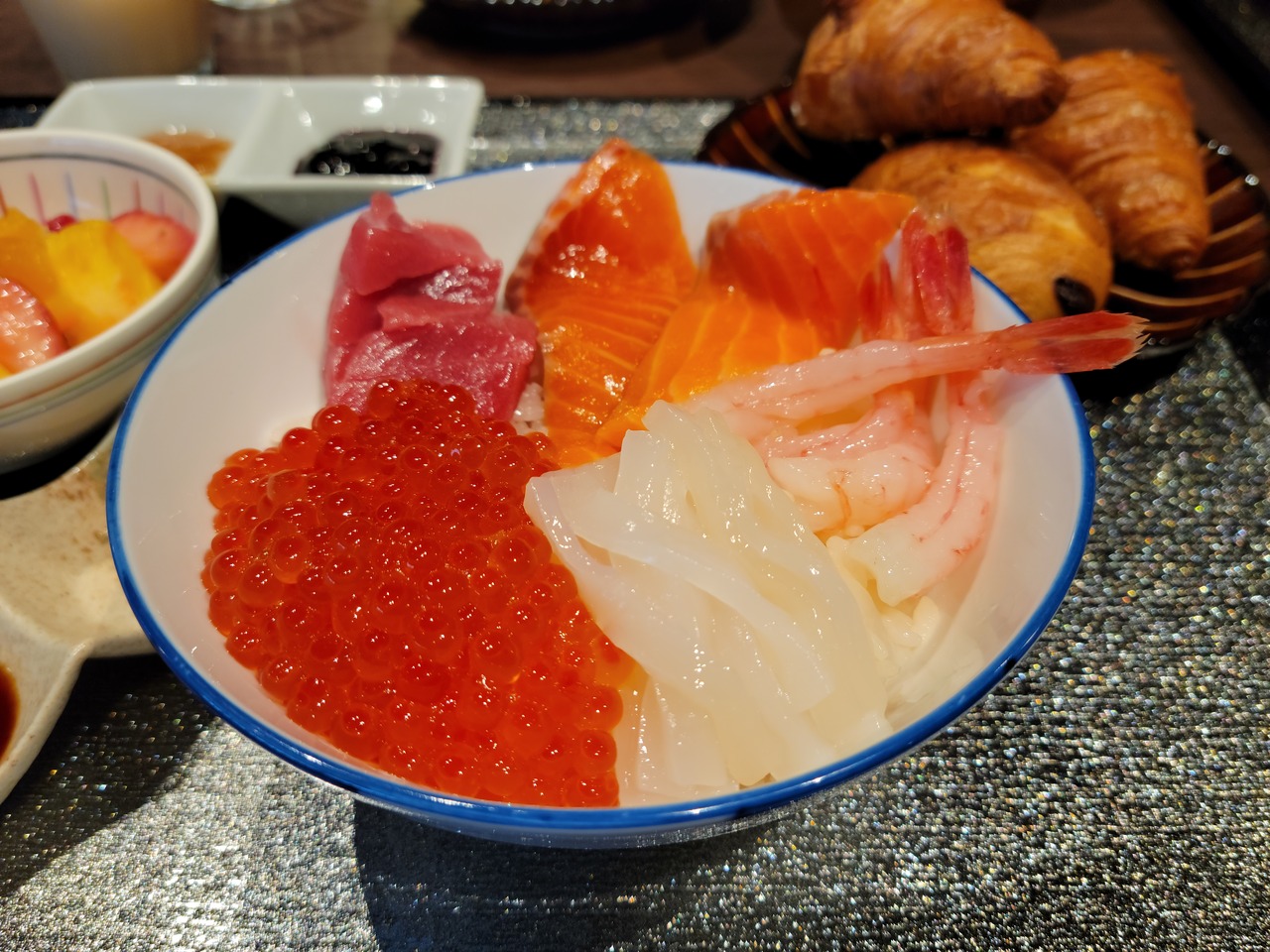 朝食はいくらかけ放題が一番の魅力。酢飯も用意されているので、ミニ海鮮丼を作れます。パンもサクサクで美味しかったです。