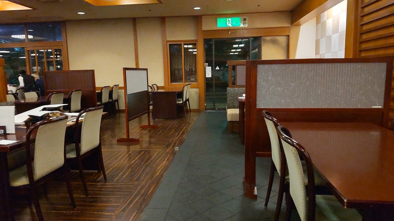 夕食(17:30~21:00)はダイニング「常磐」(飛泉閣1階・268席)で会席料理。2部制(17:30又は19:30)で予約時に開始時刻を指定できる。会席料理(10品)は質量ともに十分。テーブル間の間隔も広くて安心。