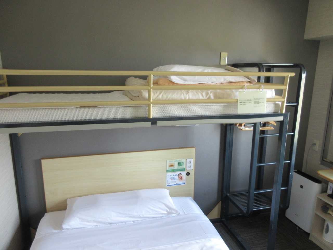 客室は2段ベッドのスタイルで、クイーンサイズのベッドのうえにシングルベッドが配置されたようなつくりです。最大3人まで泊まることができます。