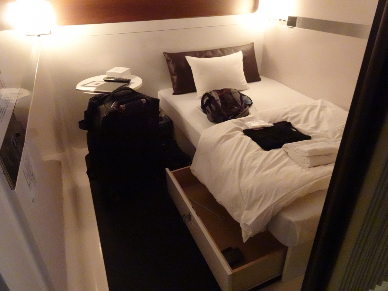 羽田出発が早いため、前夜に宿泊しました。部屋にカギがかからず、カーテンで仕切られているだけですので、音は丸聞こえです。おとが気になる方にはあまりお勧めできません。GW前でしたので、部屋は満室だったようです。連休前などは予約したほうがよさそうです。