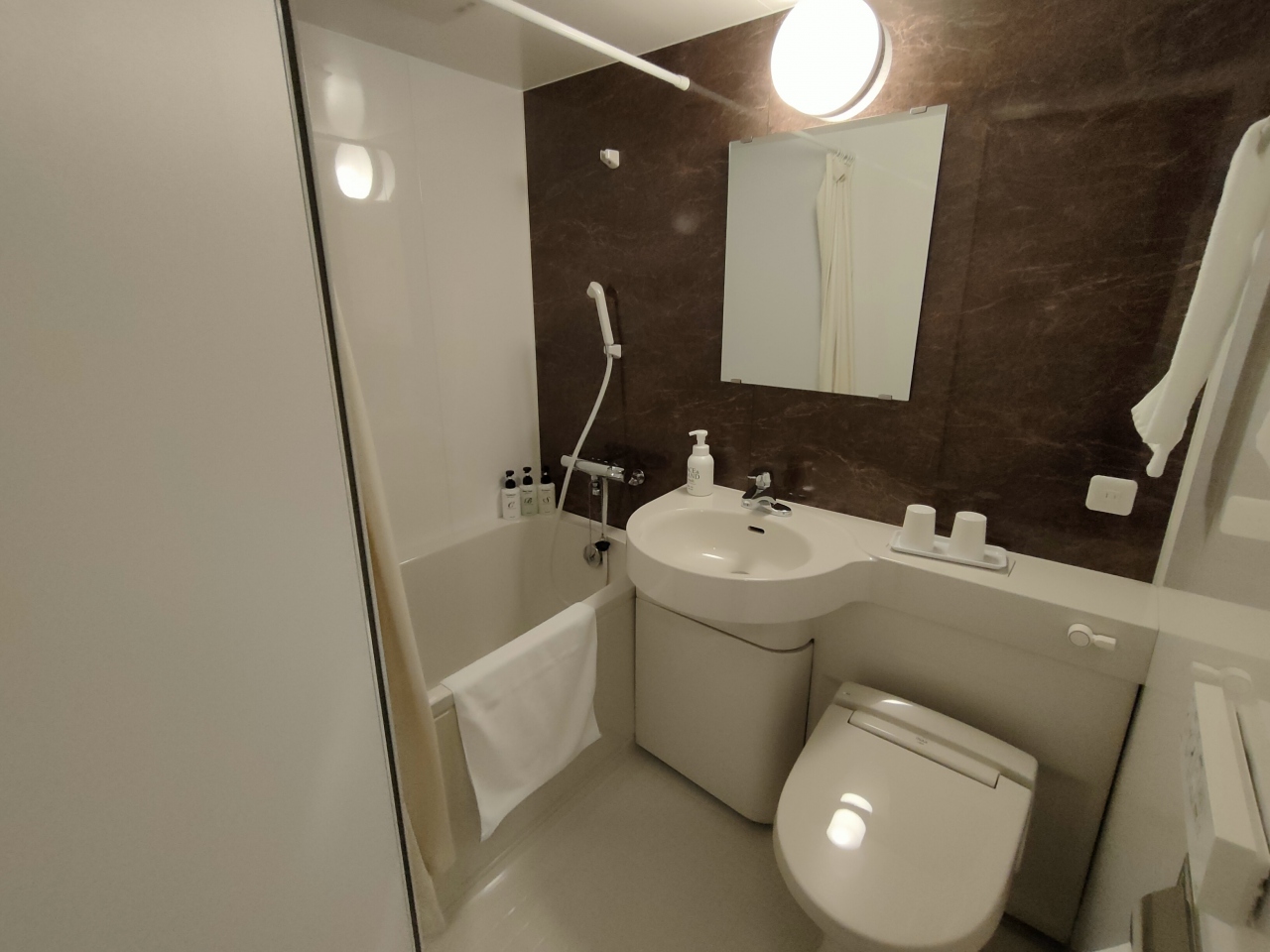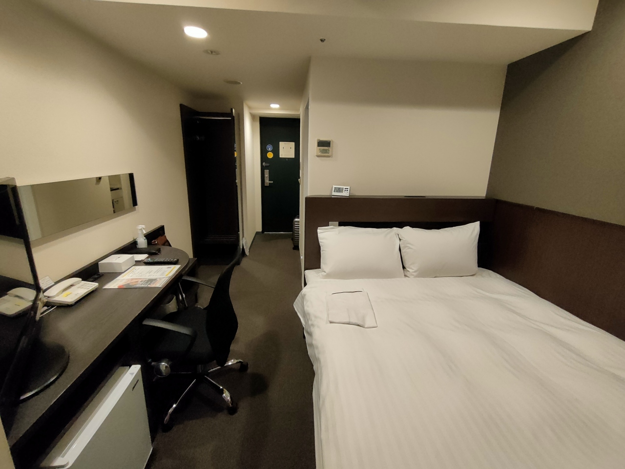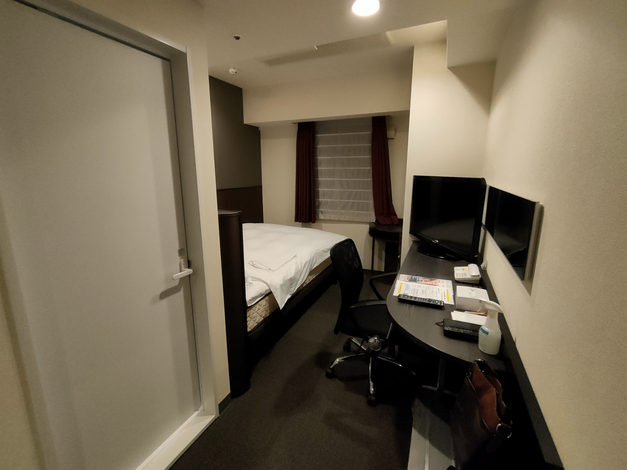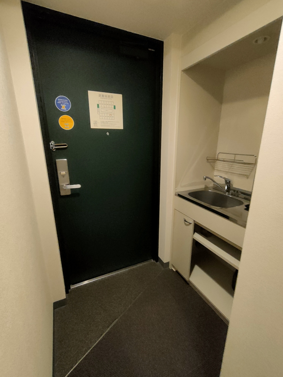 元々の設計は賃貸マンションだったのであろう建物で、吹き抜けの内廊下を通り玄関を開けるとミニキッチンもあります。方向にもよりますが、私が泊まった部屋は眺望は全くなく、目の前はアパホテルのコンクリート壁。狭いけれど設備は新しく機能的で、寝るだけなら何ら不満はありません。