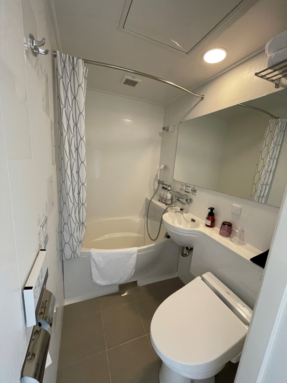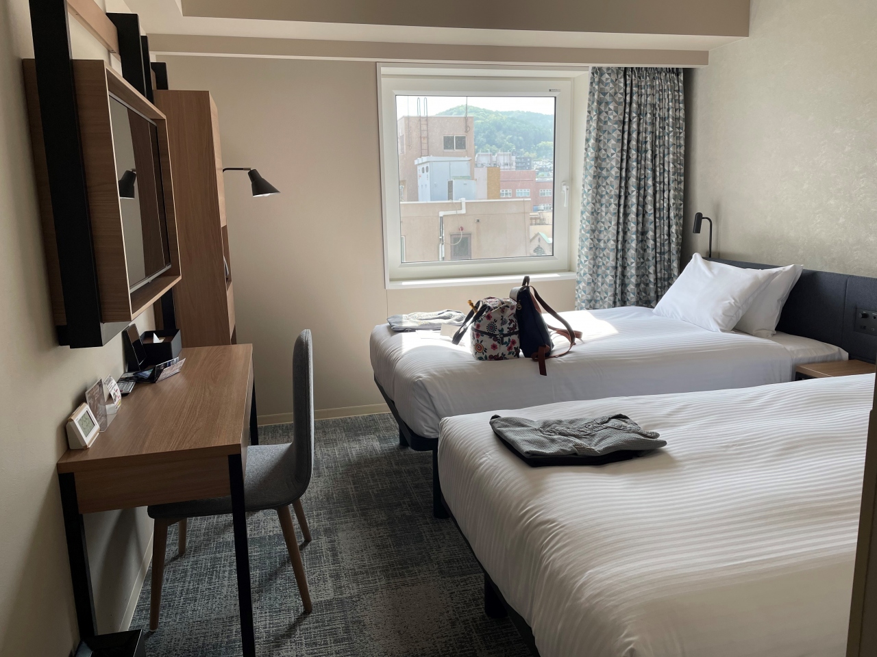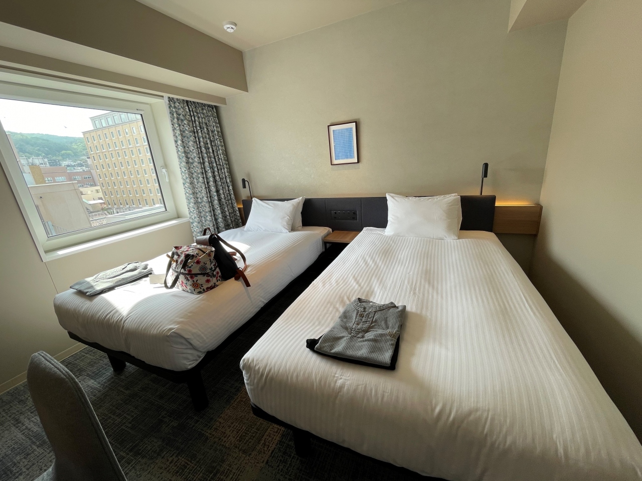 コンパクトツインですが二人で泊っても狭さは感じないと思います。バスルームも広めです。コンセントも十分な数がありテレビ下にUSBもありました。