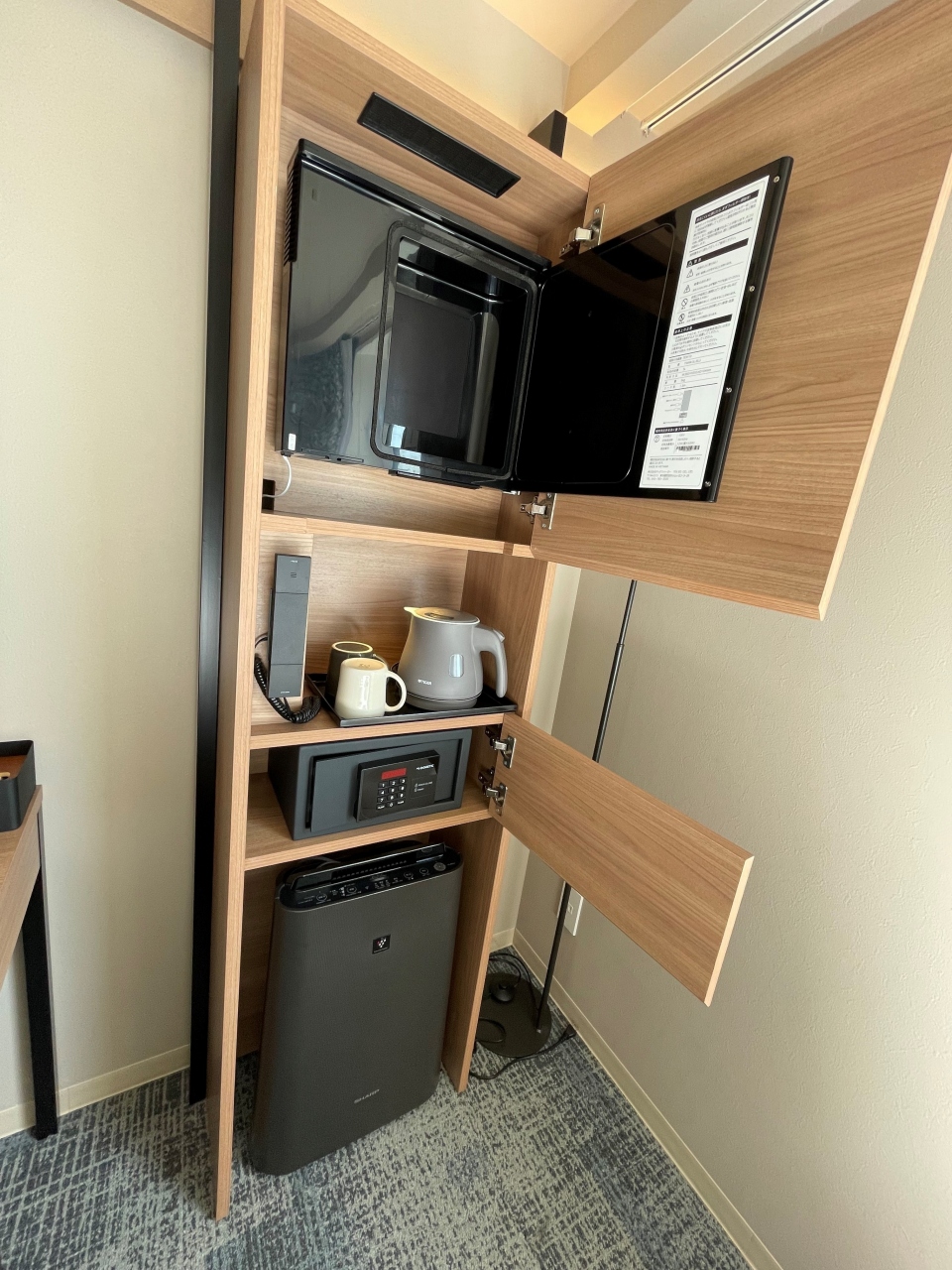 他の方の口コミにもありますが衝撃的な冷蔵庫。収納の上段の扉を開けると謎の黒いボックスがあり、それが冷蔵庫です。奥行きがなく500ミリペットボトルを横並びで3本まで入ります。今回同行した友人も同じカテゴリの部屋で予約しましたが、そちらはベッドがくっついているハリウッドタイプでテレビ下にテーブルがなく、かわりに窓際に丸テーブルと椅子が一脚ある部屋でした。