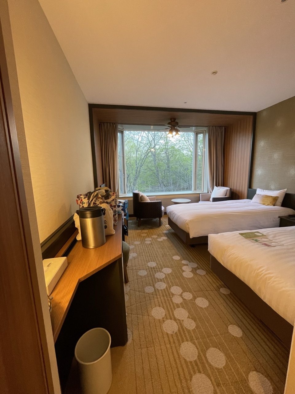 部屋もバスルームも広く、大きな窓から見える新緑の景色が良かったです。ハンガーや収納は多いですが部屋に鏡がないのが不便に感じました。