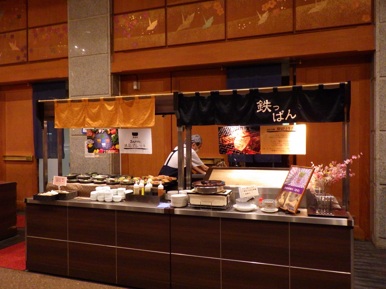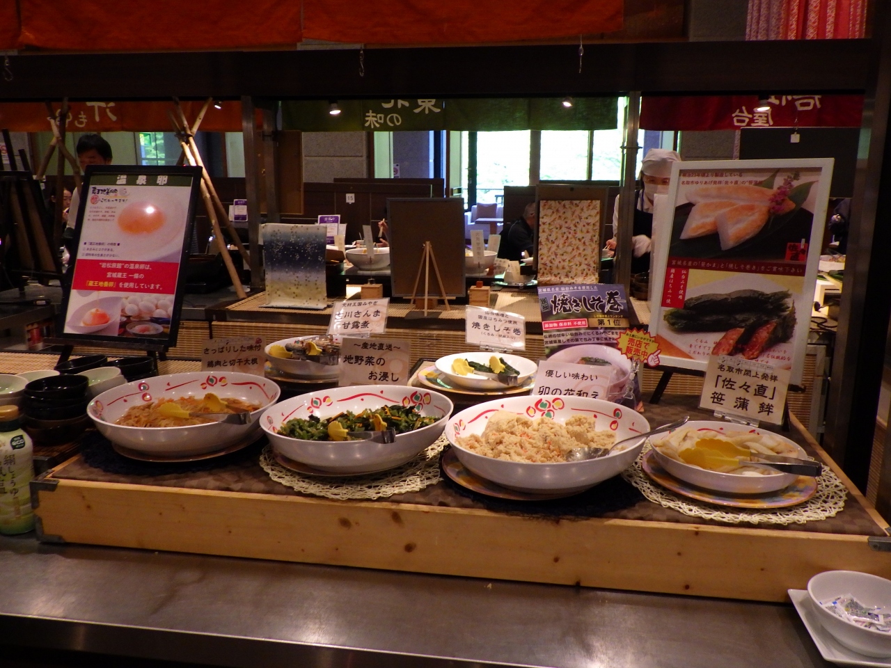 朝食と夕食はビュッフェ。仙台名物や東北の味など、地元の食材を使った料理が豊富。補充が追い付いていない料理も多く、作並元湯蒸し乳清豚地野菜を食べ損ねたのが残念。