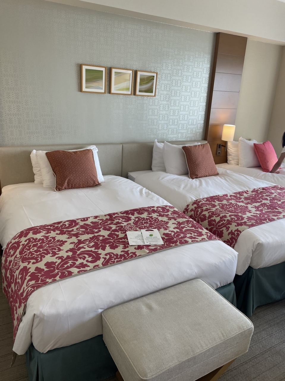 部屋タイプが色々あり予約する時相当悩みましたが、禁煙スーペリアツインのお部屋はベッド4つ置いてもキツキツにはならず広めのお部屋ではないでしょうか。アメニティの質も良く、物干しも完備、部屋からの眺めもオーシャンビュー。コーヒーマシン、空気清浄機などなどあります。掃除がしっかり行き届いています。お掃除のお姉様に、今からでもお礼が言いたいくらい笑