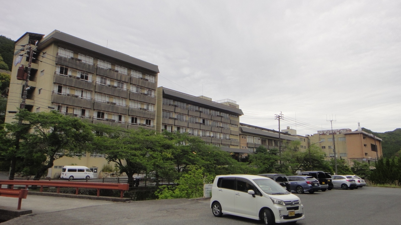長門温泉の中心部からはやや離れたところにある。由緒正しき温泉宿といった趣で演芸場(休止中)やボーリング場(休止ではないようだが、やっていなかった)なども併設する大規模な温泉ホテルだ。