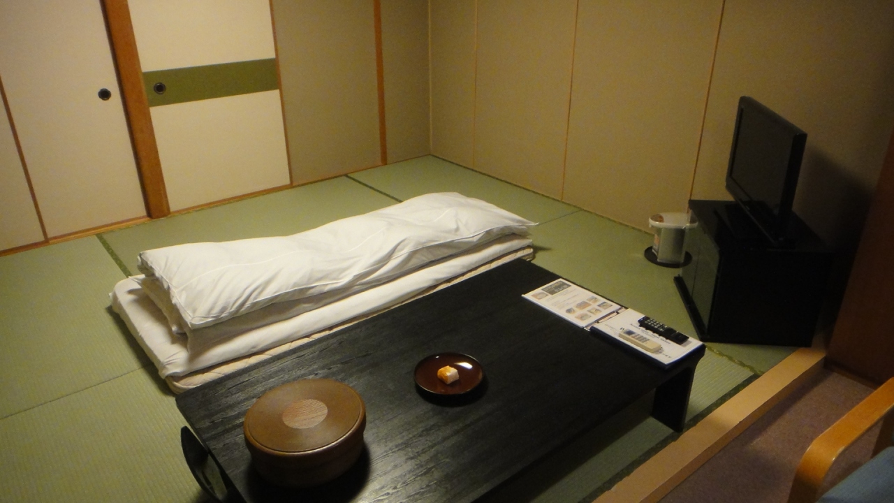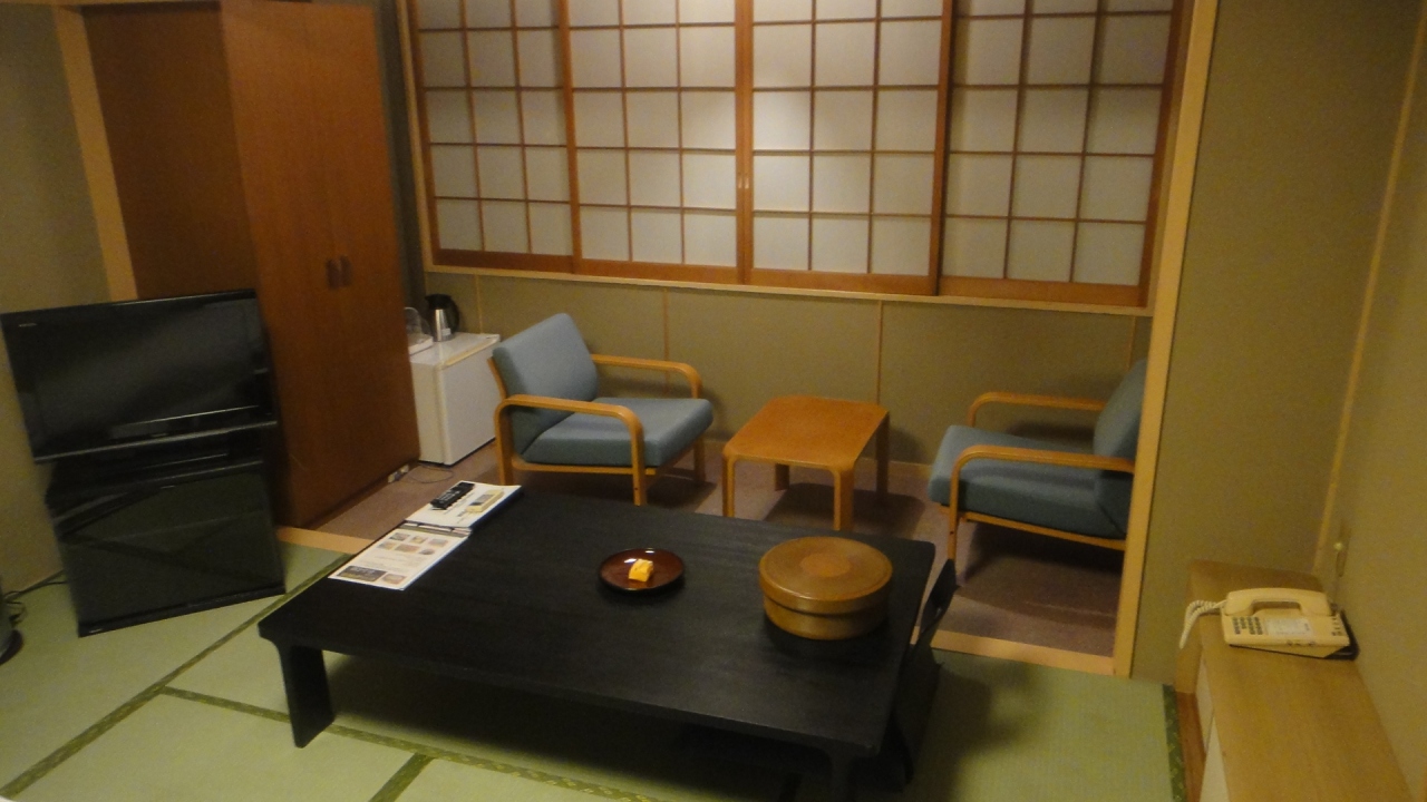 8畳の和室に夕食無し、朝食のみで泊まる。バス、トイレ、洗面所があり8畳の部屋と座卓があり、対面の応接セット。眺望はなかった。部屋自体は不足はないが、wifiがフロント周辺のみなのが不便だった。飲食は併設の居酒屋が21時30分まで、周囲にコンビニはない。