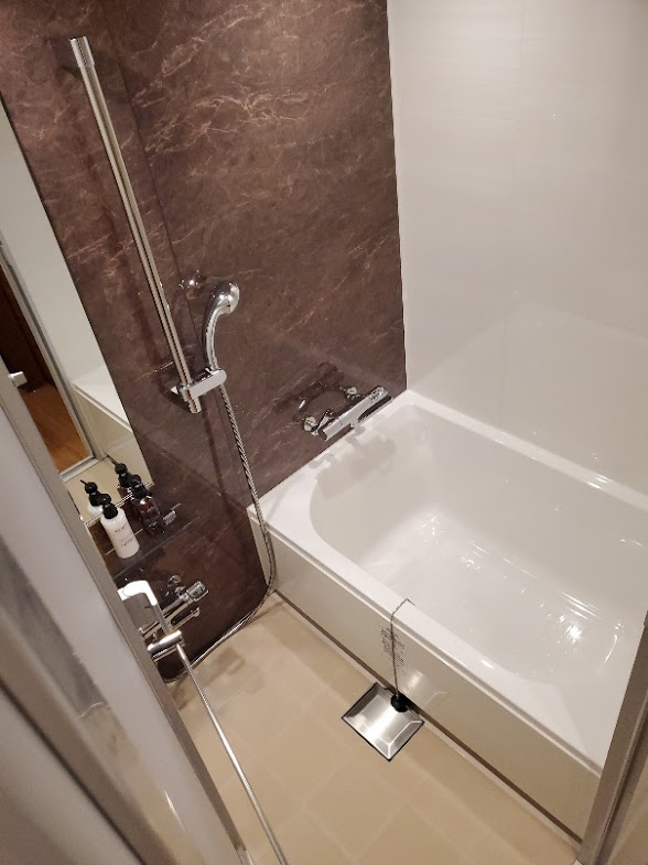 ちょっとした半円形な浴槽で、 どうしても膝は伸ばせませんが、あぐら的な格好なら、肩までドップリ浸かれるし、お風呂場は文句のつけようがないくらい素晴らしです!!!