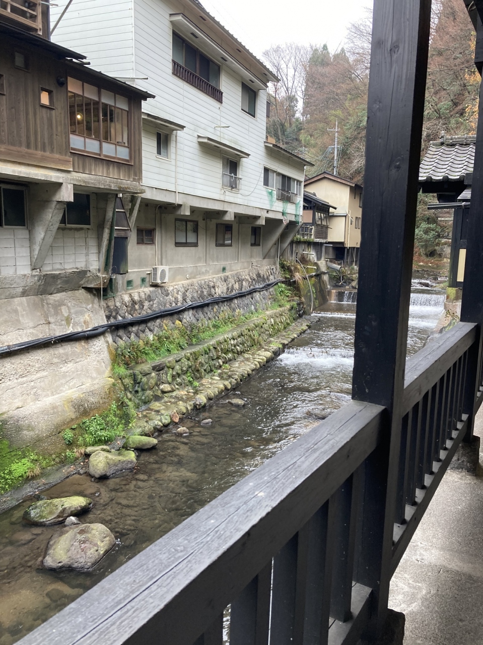 黒川温泉の中心地に位置しており、そぞろ歩きするのに便利なお宿。こちらのお宿も洞窟風呂が有名で、立ち寄りの方がたくさん来られていました。出入り口近くにベンチがあり、湯上がりにのんびり涼むことができます。脱衣所は暖簾がかかっているだけで簡易すぎます。
