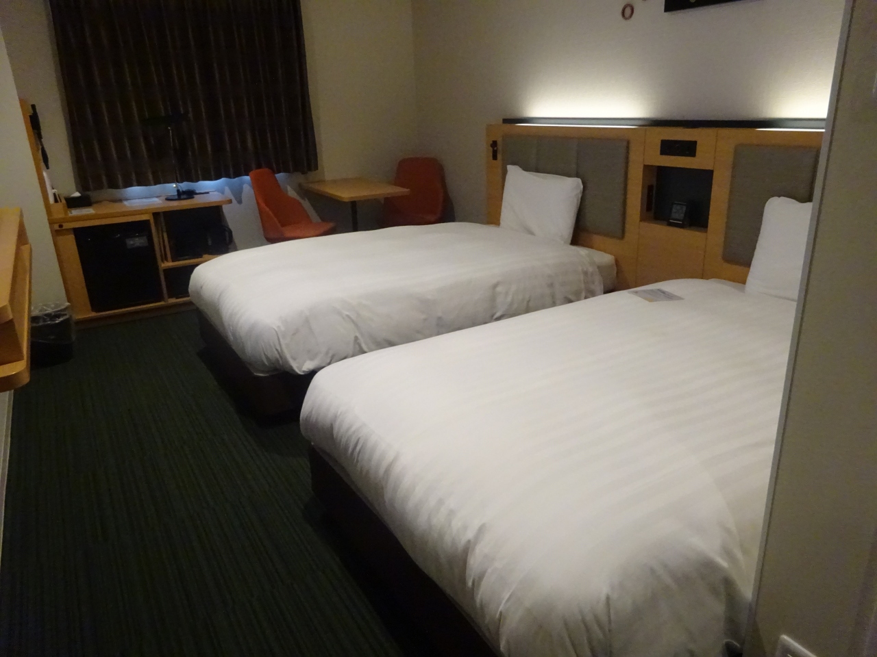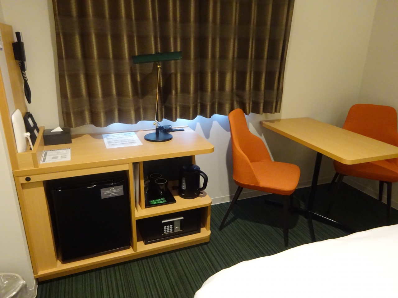 客室はベッドの寝心地も良く、水回りも新しく清潔。カウンターに前客の飲み物の跡と思われる汚れが付いていて、ティッシュを濡らして拭いたら取れましたが、清掃は☆ー1。歯ブラシ以外のアメニティやナイトウェアはロビーからもらっていく方式です。ドライヤーの温風の風量は充分でした。