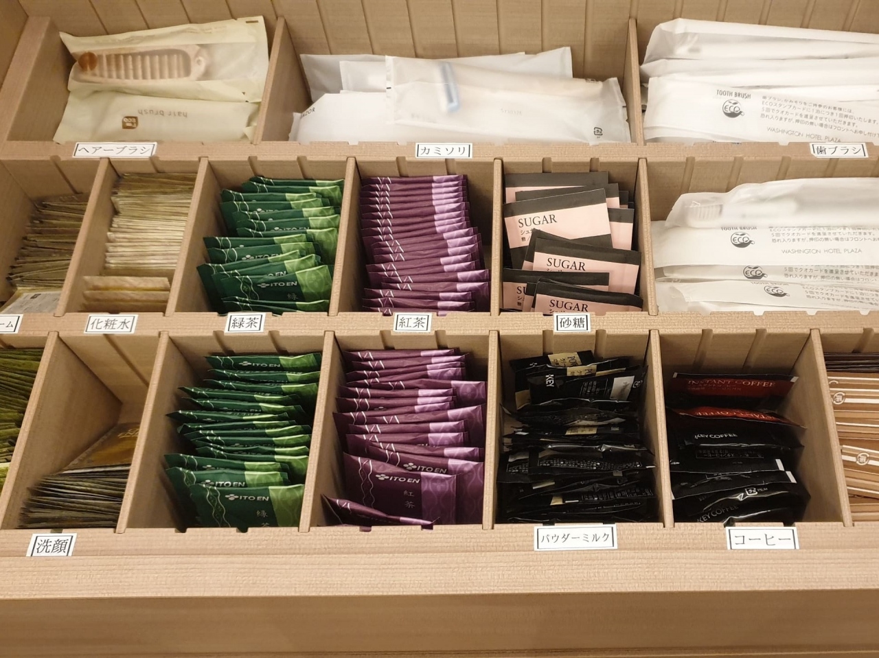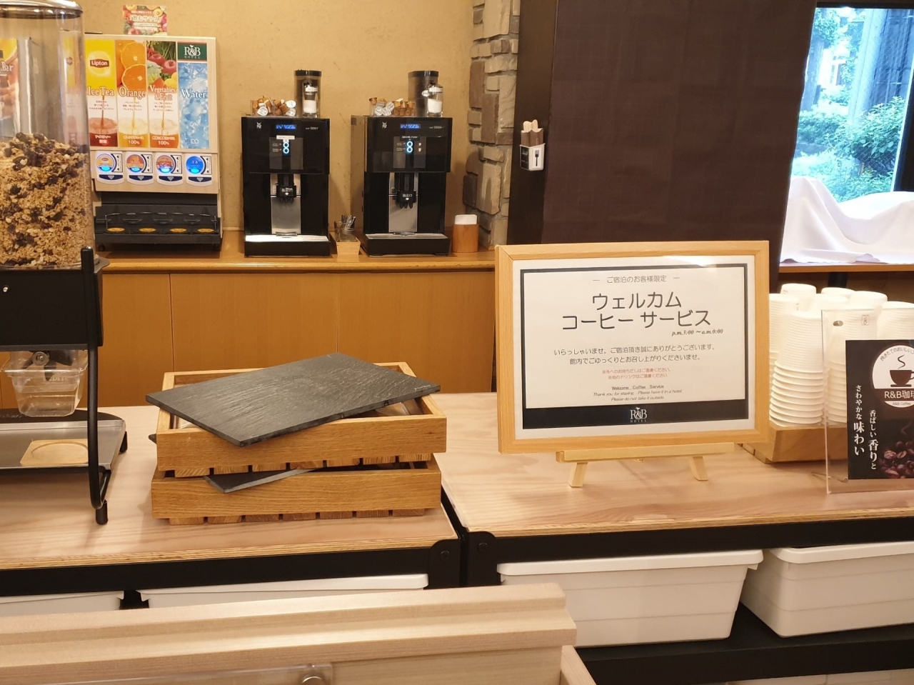 コーヒーのウェルカムドリンクと、アメニティがフロント横に。アメニティは歯ブラシ、ブラシ、カミソリと、私の宿泊時点では美容系はクレンジング・洗顔・化粧水・乳液とDHCの4点セット。ドリンクはKey coffeeのインスタントコーヒー、伊藤園のティーバッグ紅茶、緑茶。