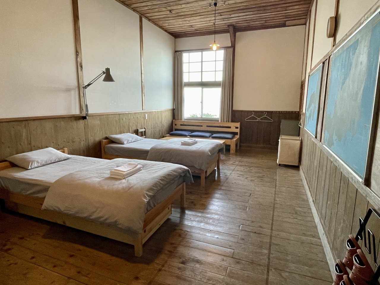 シーツはセルフで自分で敷くスタイル、エアコン、湯沸かしポット、冷蔵庫完備。