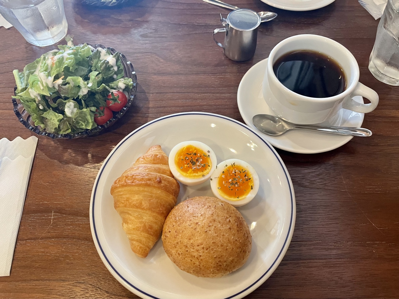 朝食は前夜に予約でサラダ、パン、卵にコーヒーとシンプルな朝食。